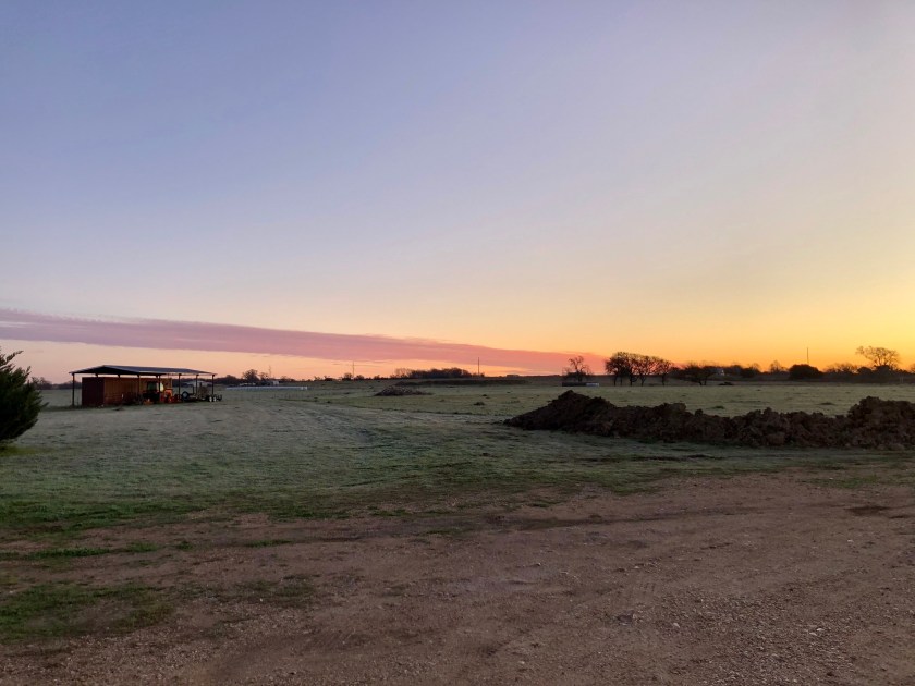 Today I was supposed to stay at the ranch so we could work on the chicken coop. It’s nearly sunset. I got in a whole day of Planview work. I fed the horses. I walked the dogs. I’m worried Carlton has been killed by a cow, because I tried twice to get him to come home but he kept going back. Then it got silent.