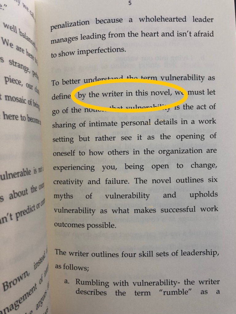 As I read the first part of the book, it because clear that it is a book report penned by a 14-year-old in the UK (there’s a “Lessons Learnt” chapter) trying to get the paper long enough to fit the teacher’s requirements. Poor Brené is referred to as “the writer” endlessly, and poor Dare to Lead is repeatedly called a novel. If it’s a novel, the character development and plot both suck.