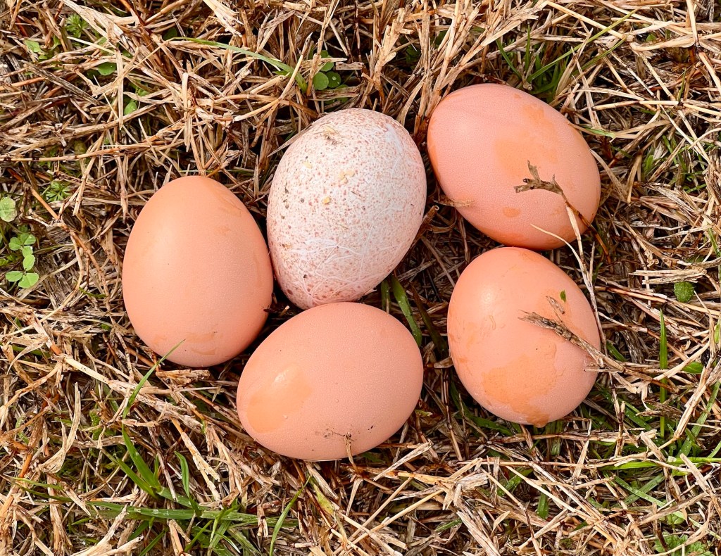 What I can’t complain about is Connie Gobbler. She’s all grown up now, I guess, because she laid her first egg today! And it does look like it has the measles!