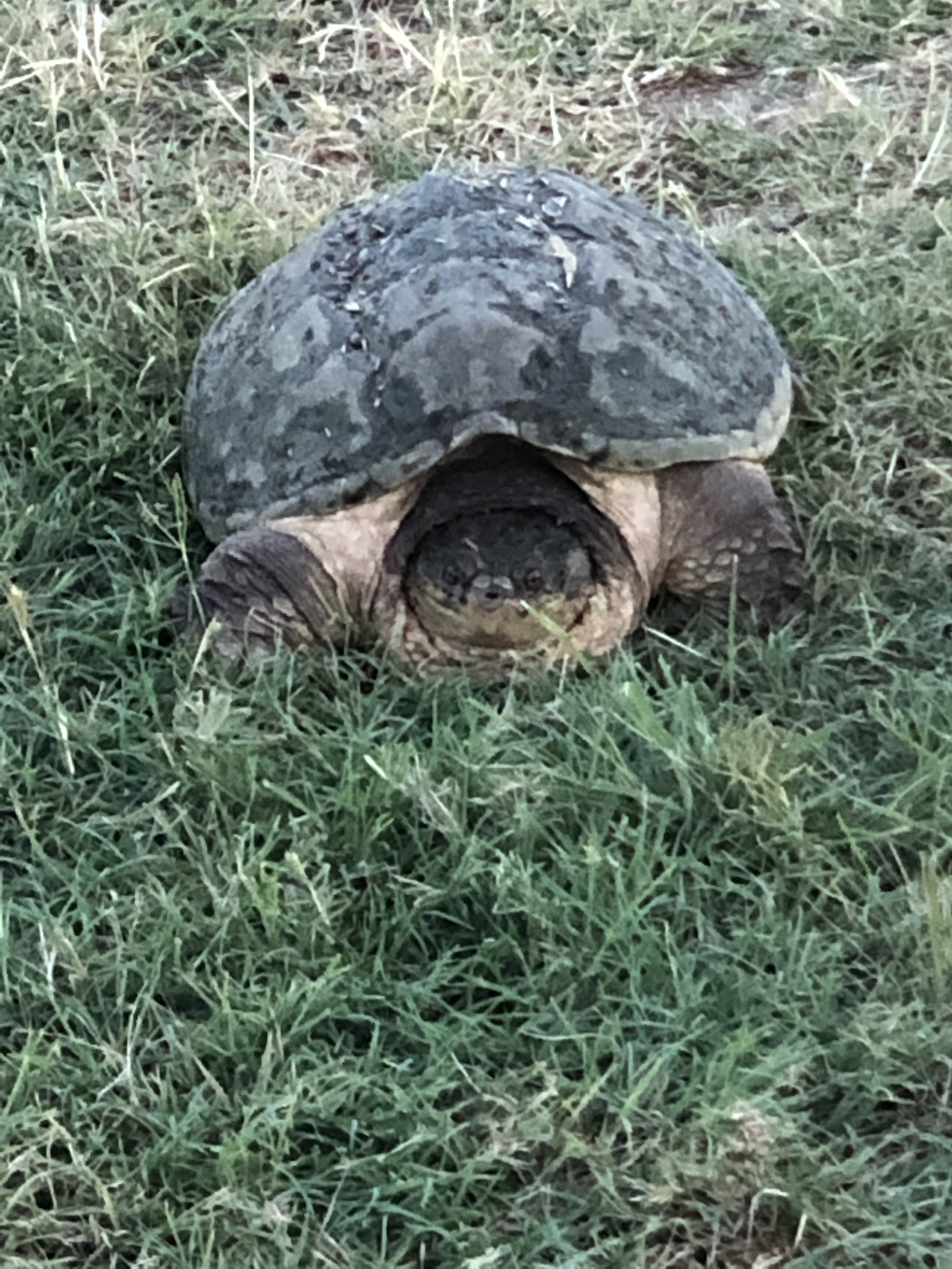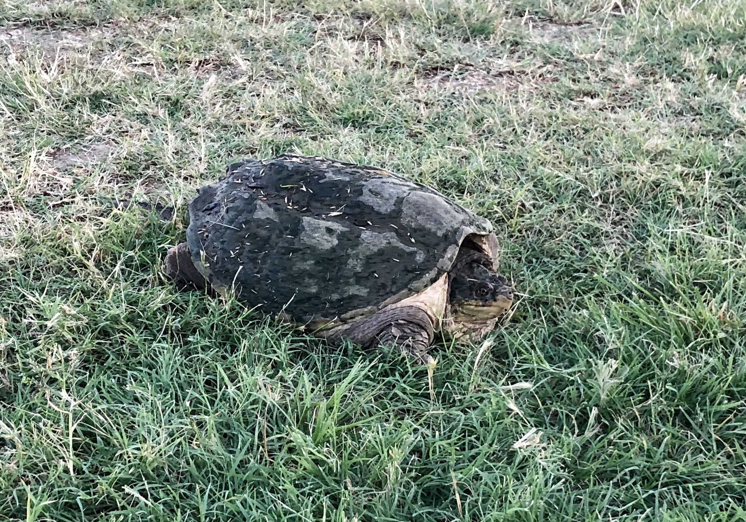But I quickly recognized the shape. It was Snappy, our resident snapping turtle. Or maybe Son of Snappy (or daughter). I was glad the dogs were off rolling in poop, because I could do without them losing a toe or nose.