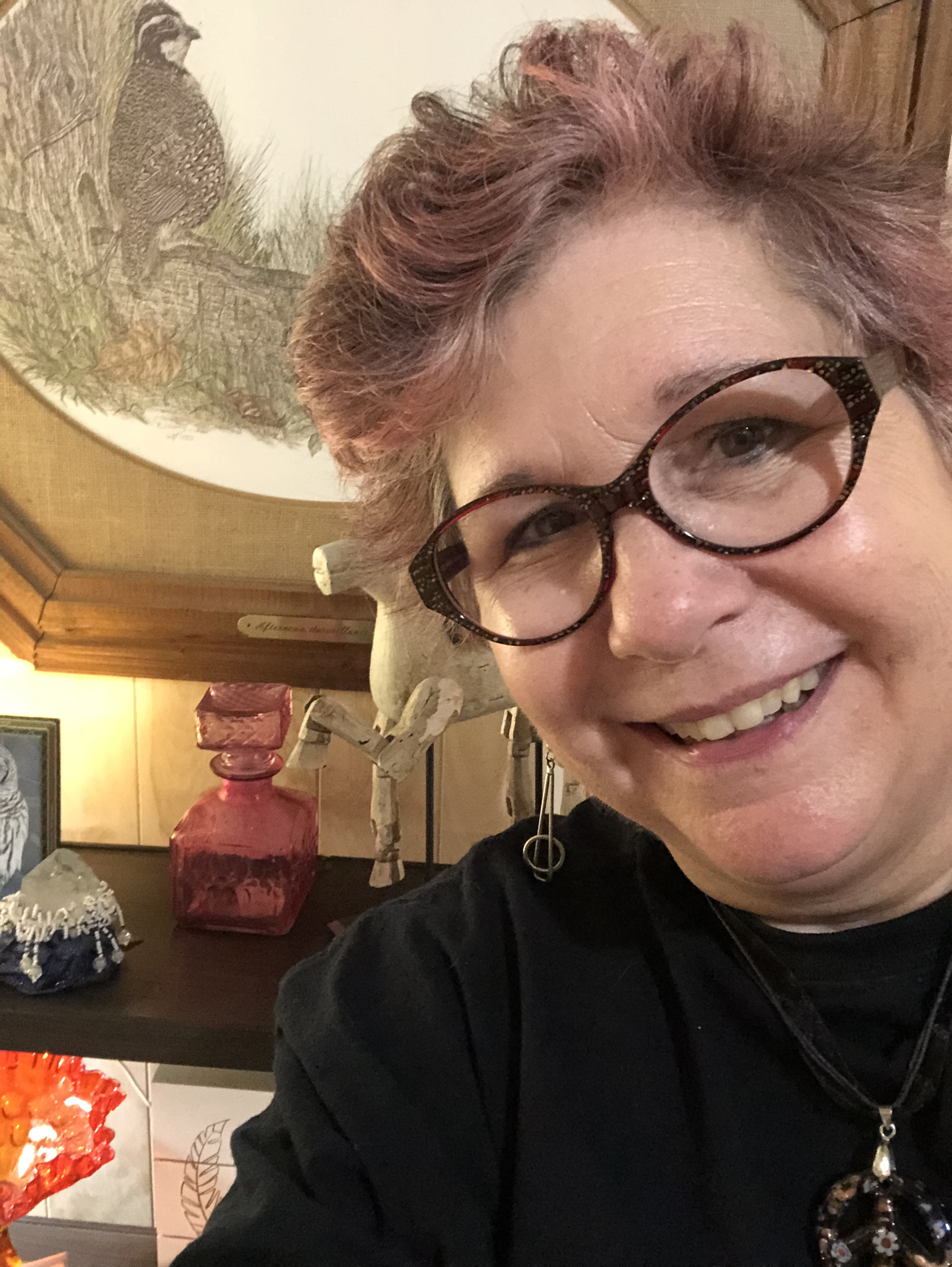 Me looking tired, but proud of my pink glass decanter to go with my orange glass.