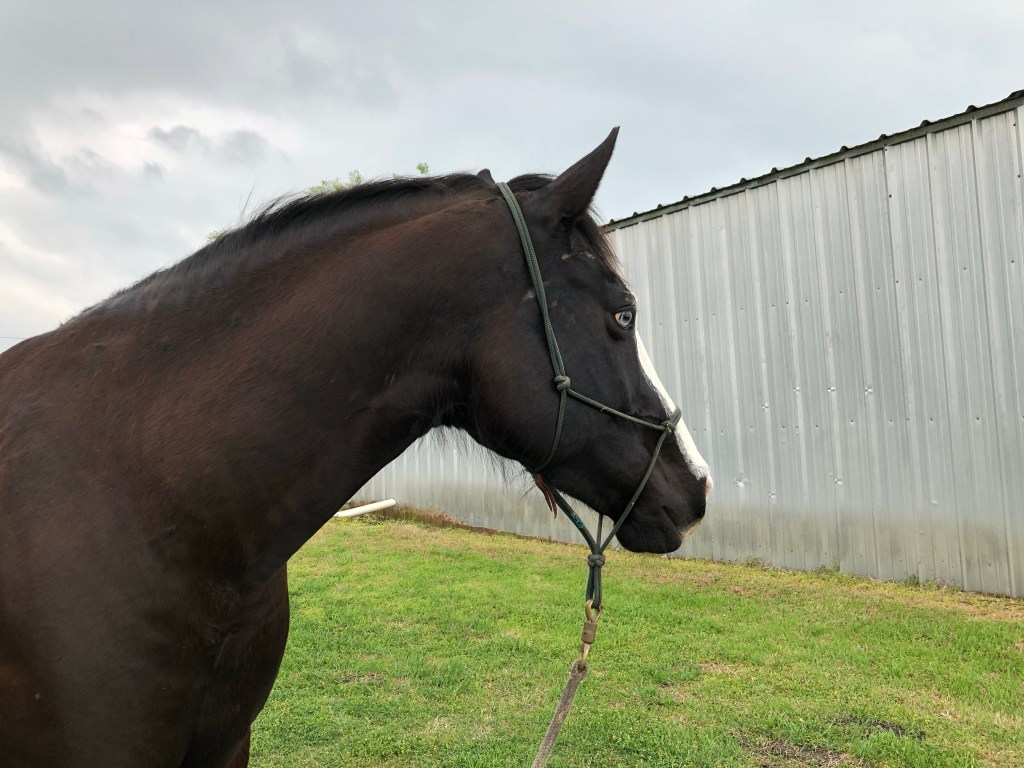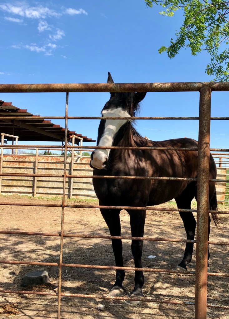 Ace is a huge, black solid paint gelding (that means he has the pain gene, but isn’t all spotty). He’s so tall Sara has trouble putting his halter on. He has one blue eye and tiny bits of white on him. Not only is he gorgeous, but he has a great personality.