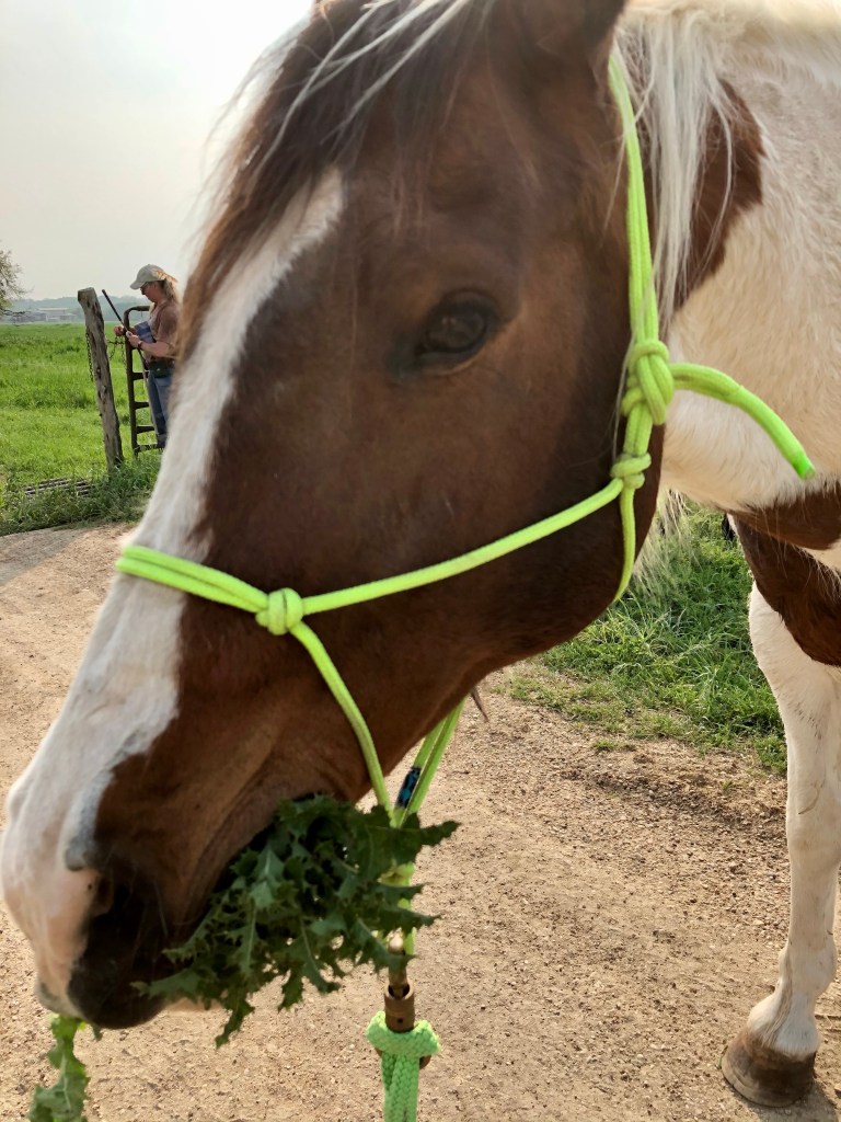 Apache had already been a bit of a handful, focused on grass and not me. I was a little worried she’d spook him. So, I stopped him and breathed deeply. He just watched Fiona acting like she had a bee up her butt. I counted that as a win.