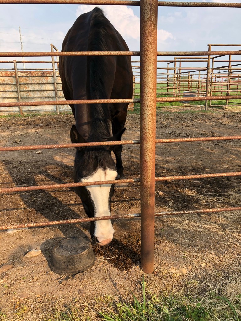 As we were leaving, we fed the horses their grain and supplements. We of course gave Ace some, to make up for the wormer he got earlier. Well, he didn’t think much of our beet pulp and toppings. We think he didn’t like the garlic. It was really funny watching him dig through the bowl trying to find something palatable. He ended up dumping the bowl upside down and looking very disappointed.