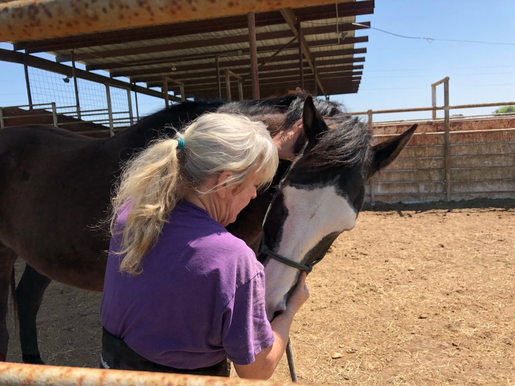 I called Sara over and demonstrated on the other side. This time he curved his back downward to avoid the brush. So, Sara, who knows a lot more horse stuff than I do, did a test with her hands going down his spine, and whoa, did he react right at his withers (shoulder area). Obviously, I was NOT going to ride him. Poor guy!