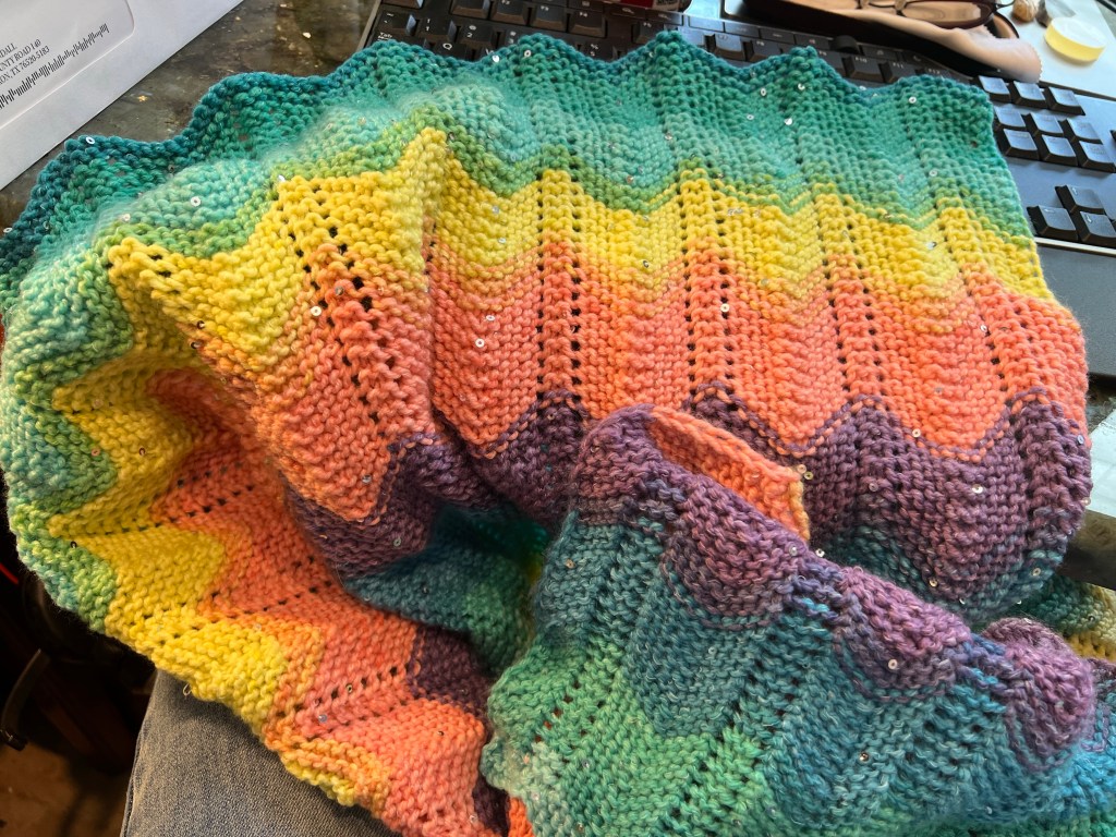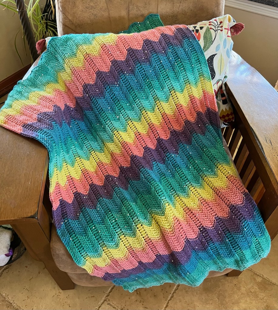 Mandi asked for a ripple afghan, which is easy to crochet, but it hurts my hands too much. So, I looked for knitted ones. I didn’t like any of the ones I found, so I just did it the way I wanted to.
