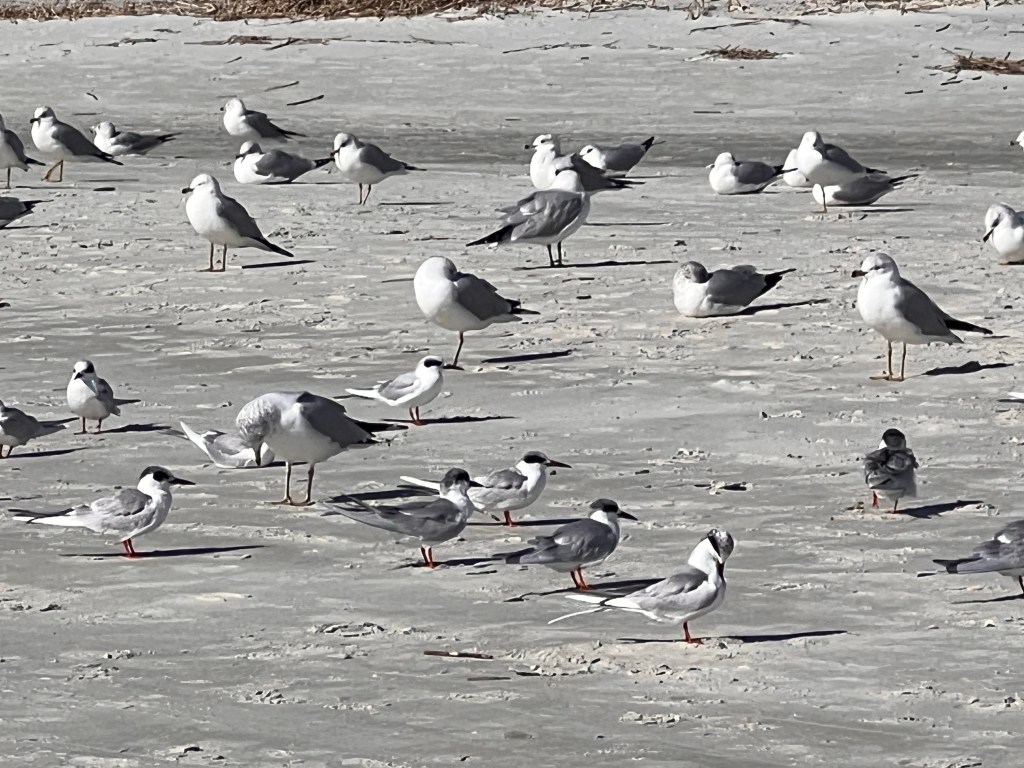 The shore birds, when I can find them, have also added to my totals and life list. I got a new one and saw many interesting others when Lee and I finally went over to Mitchellville, a historical Gullah area, to the beach there. I’d read that Fish Haul beach has great birding, and yep, it does.