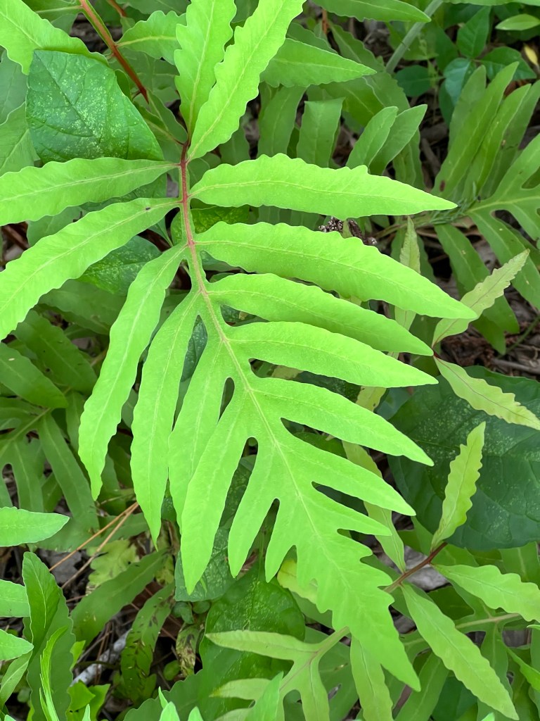 Imagine my happiness when I saw that next to the store was a beautiful wooded area with a stream running through it. It was sort of like what I imagine in my mind when I think of a southern American woods. There were oaks, sweet gums, ash, and holly trees, with ferns and palmettos underneath. There were jack-in-the-pulpits and lizard’s tail. Vines included muscadine grape, poison ivy, and Virginia Creeper. I was in heaven. Plus I got to buy a windbreaker.