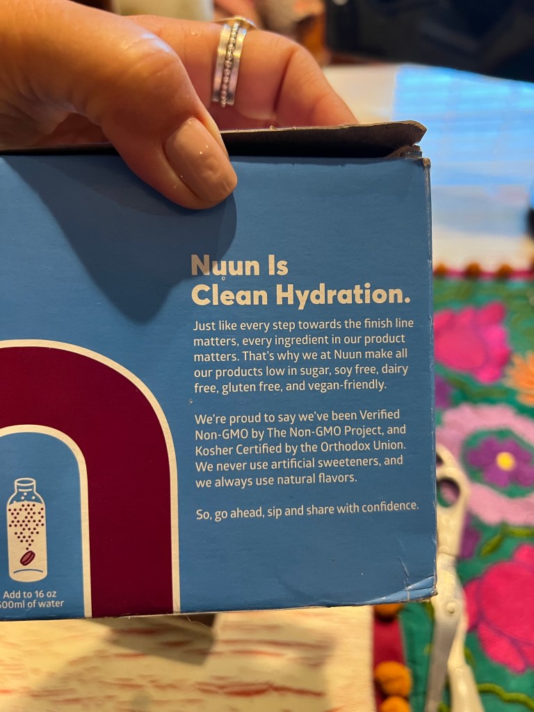 I got the Nuun stuff yesterday, and discovered I liked them just fine. They aren’t too salty and sweet like Gatorade products can be, and I appreciate that they are sweetened with Stevia (but not too much). And look at all those things that will help my body! Potassium! Magnesium! Other stuff!