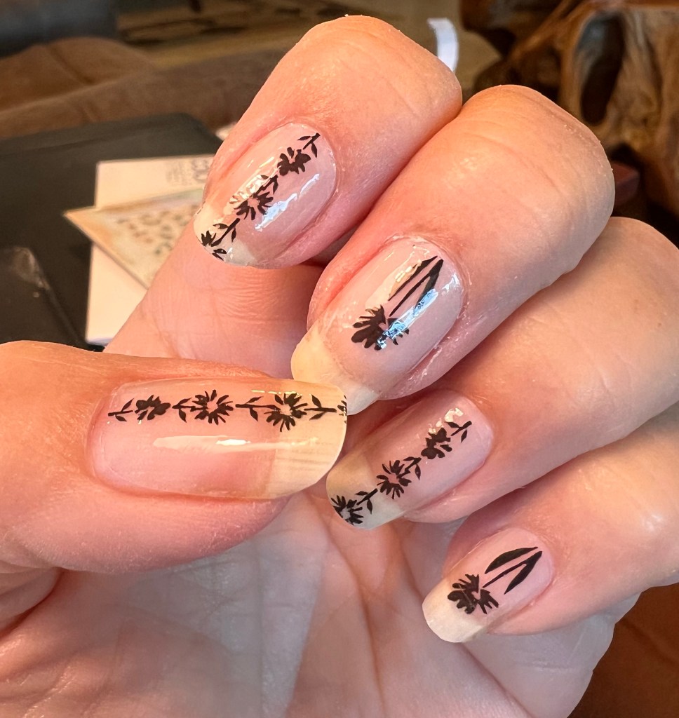 Lucky for me my nails are good. I can make them as gaudy as I want to. I put a “jelly” layer over cute little flowers. Then I stuck shiny stuff on there. Hey, everyone needs a hobby.