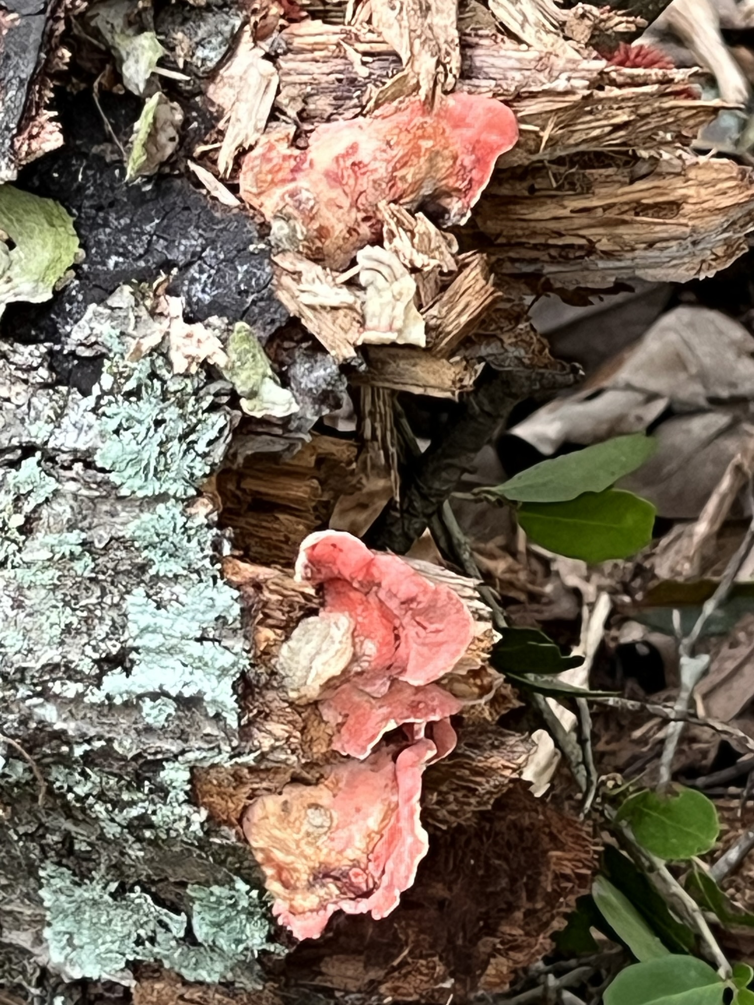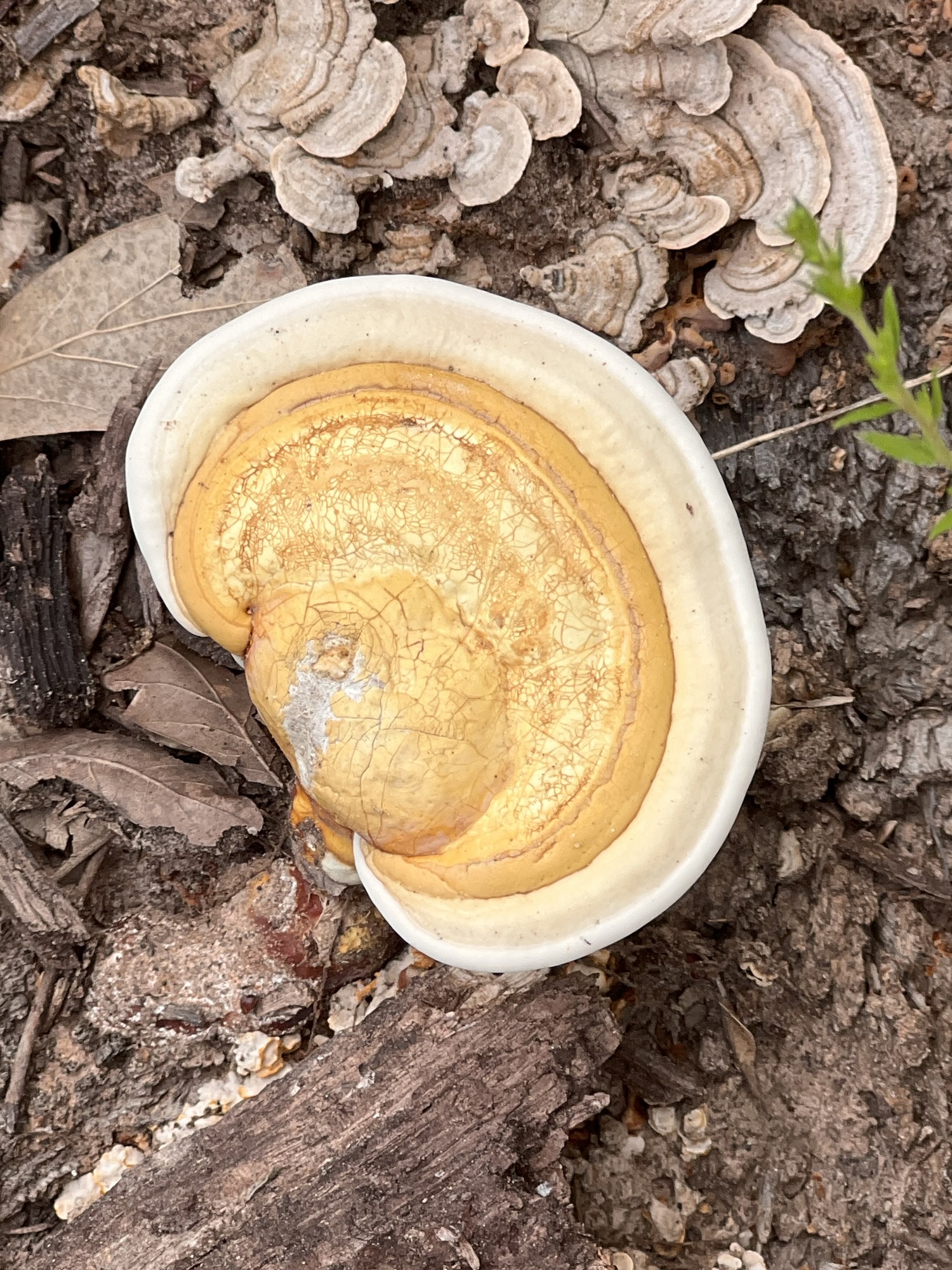 I think it’s pale cow hair mossIt was kind of shinyLatte bracketGolden reishi Coral-pink meruliusRingless Honey mushroom