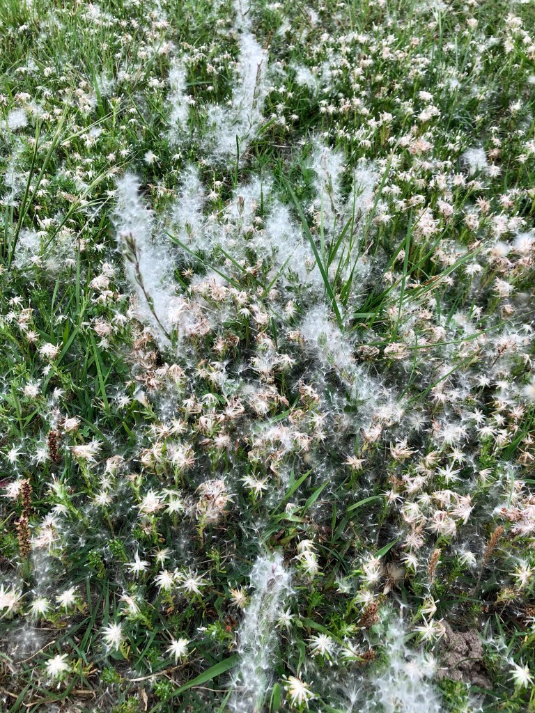But, have you noticed how many members of the dandelion family are actually out there in our fields, pastures, and yards? I have been greatly enjoying some of them, including the tiny weedy dwarf dandelion Krigia cespitosa, the shy smooth cat’s ear Hypochaeris glabra that spends most of its time tightly closed up, and the extra prickly one, prickly sowthistle Sonchus asper.
