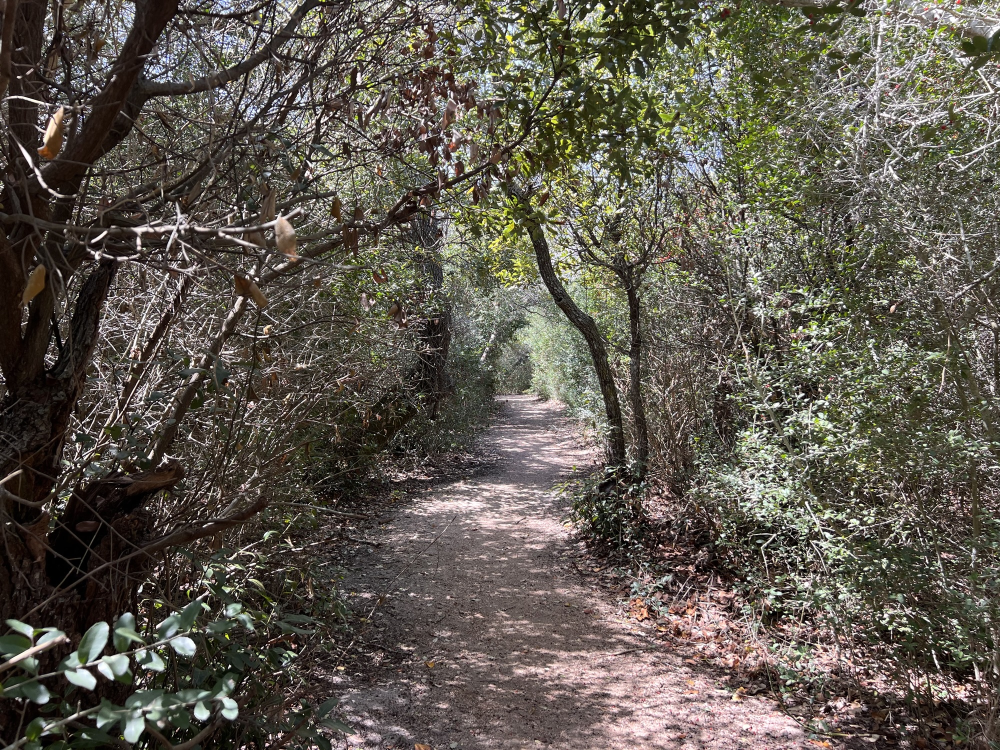 Many beautiful oaks on the pathsCoralbeanSweet baySome kind of palm White top sedgePartridge peaYaupon holly Lovely meadowsTurkscap trail