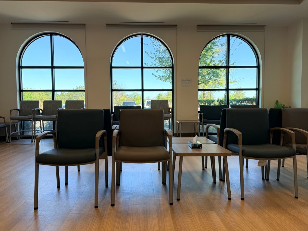 Then I came to the empty waiting room and took a nap. Yes, in the chairs above. What a treat!