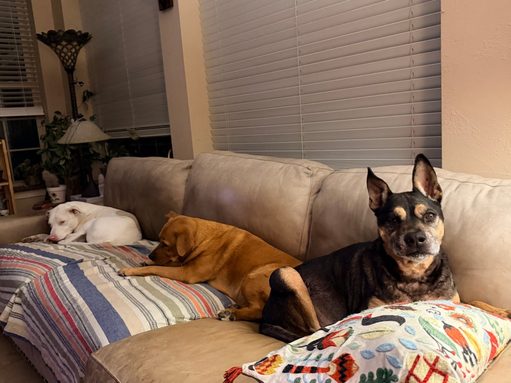 Three dogs on a couch wish Anita well.