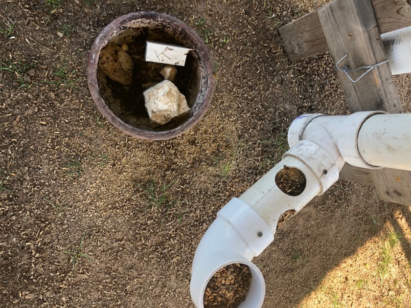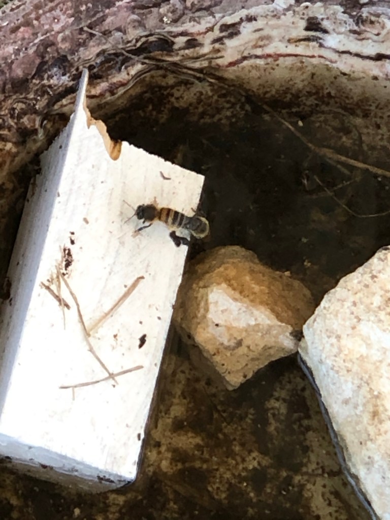 I guess I haven’t waited long enough, because I have only seen a couple of bees check out the water, and there are still very many on the chicken feed. I think I’ll go out and put in some sticks and flowers and the things Pamela had. It’s an ongoing experiment.