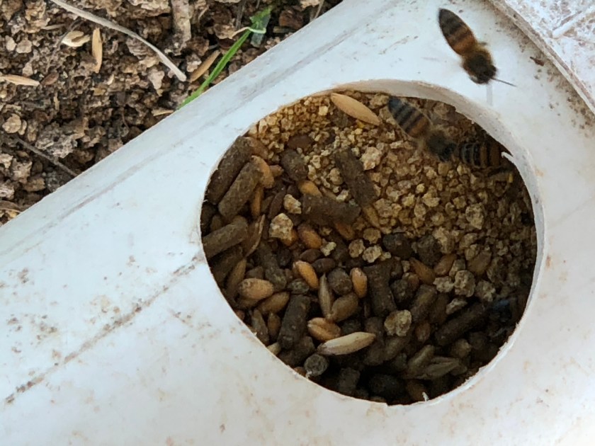 I wasn’t sure if I needed to do that, since dozens and dozens of bees have been sampling the chicken feed, which makes me worry about how much sugar must be in there!