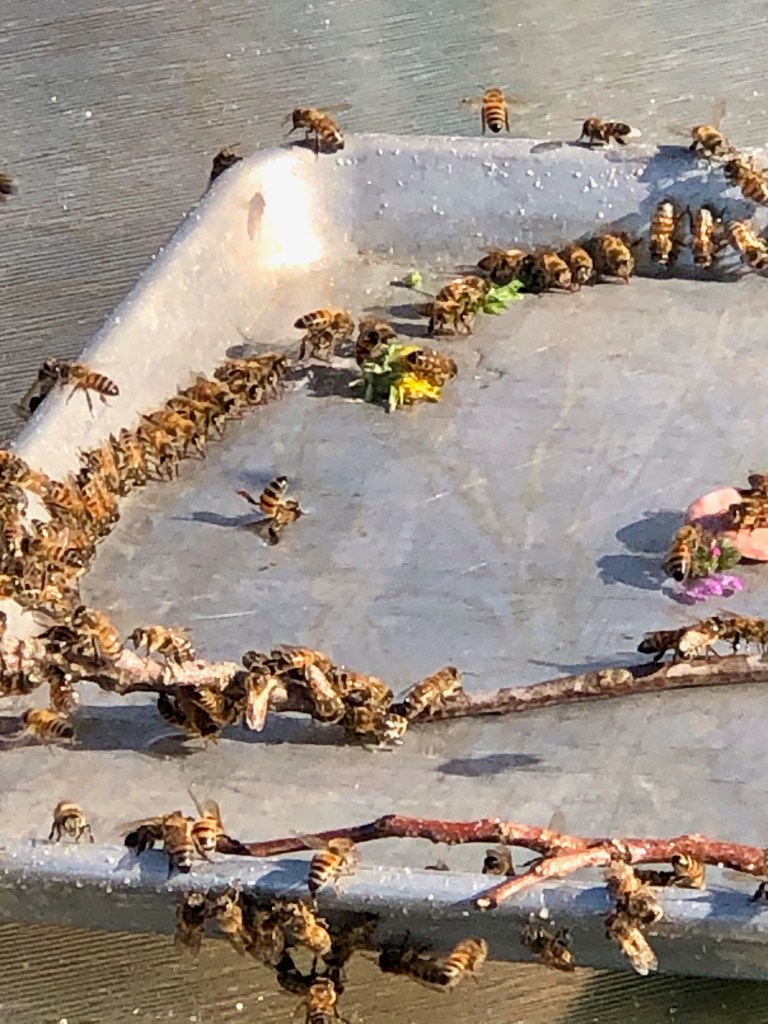 When I went out to check the mail, I took a detour by the chickens to see how the bee feeder was doing. I was happy to see that they found it, and could tell I made the liquid too deep. So, I added some flowers and sticks they can hold onto. Immediately the bees started using them, and more arrived. My heart is full.