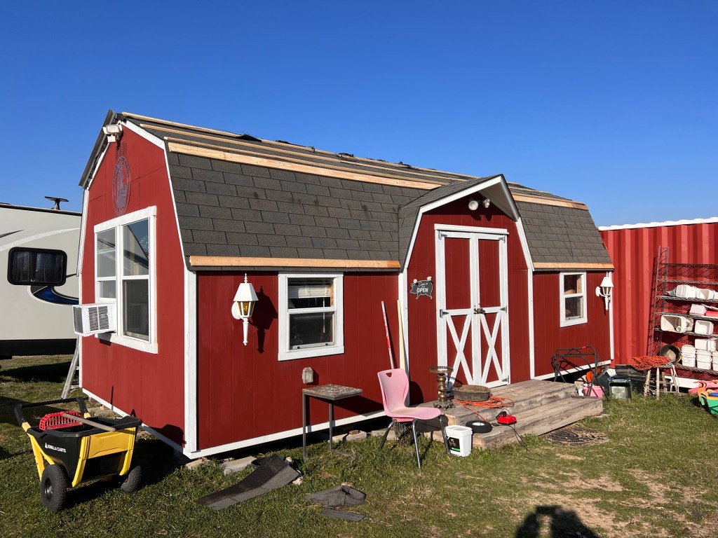 The tack room at the ranch is getting a much-needed upgrade. We’ve limped along with tarp covering its ancient shingled roof, but the winds in recent days have shredded the latest tarp and blown off more shingles.