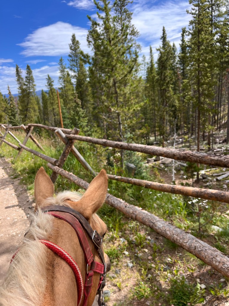 I decided that, while I was there, I might as well ride. It turned out the only other people there at that time had booked a private ride, so I got one, too. I’d been afraid that I’d be in a big line of horses. But no, little palomino Dreamer and I just followed one butt, that of Ethel, a young draft mare just learning to lead groups.