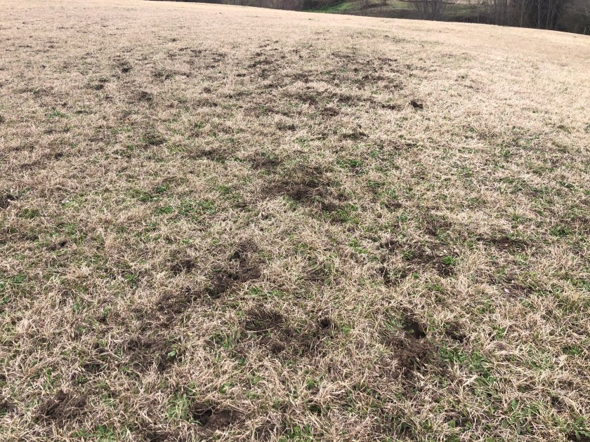 And now for another mess. When I looked outside this morning, a part of the field in front of the house looked suspiciously blackened. What could that have been? I hoped it wasn’t hogs. I was at an angle to where I couldn’t see exactly what was going on.