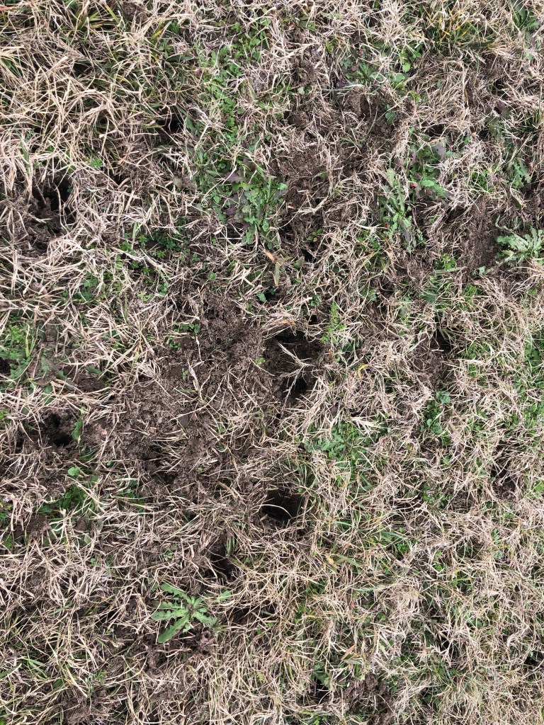 After my morning meetings, I headed out to inspect in person. DANG. It looked like a wild pack of armadillos had come through and feasted on something.