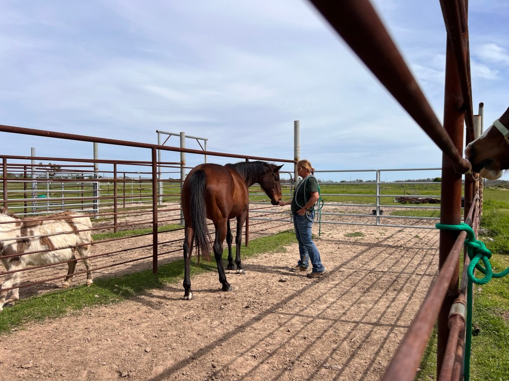 Mabel let me brush a lot of mud off her before Tarrin arrived. Then I got to watch how Tarrin gained her trust by being patient and calm. Soon enough, Mabel volunteered to be haltered. Tarrin just approached and retreated and let Mabel sniff her hand as she shaped it just like a horse nose. I learned a lot.