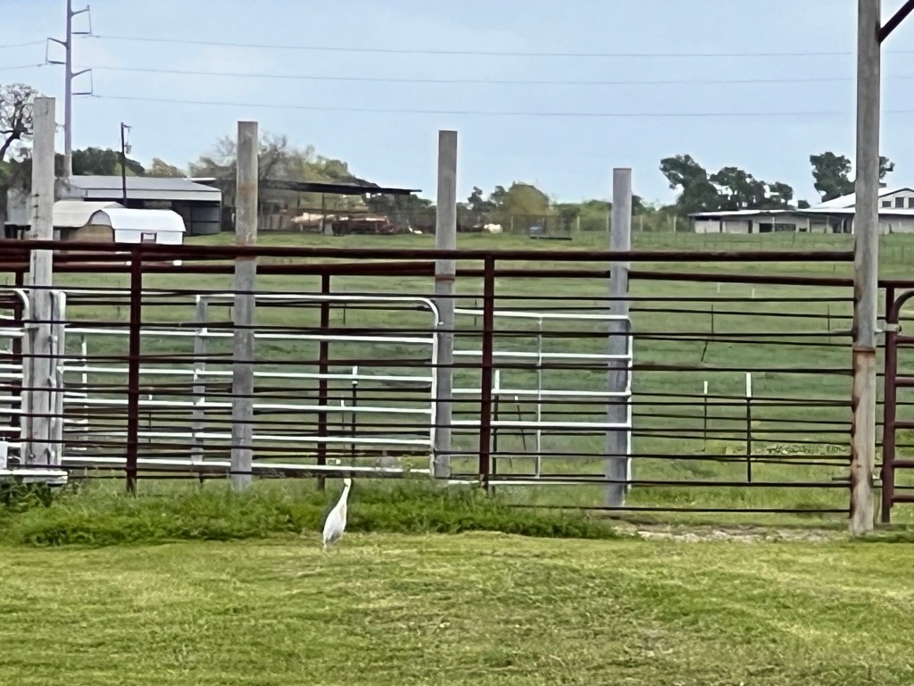 It was another pleasant spring day, the kind that makes you forget you live in the land of unbearable summers. Since my dear spouse isn’t big on doing anything involving leaving the premises before noon these days, I had the morning all to myself. After I fed the chickens, I looked over at the horse pens and saw a white bird land on the ground.