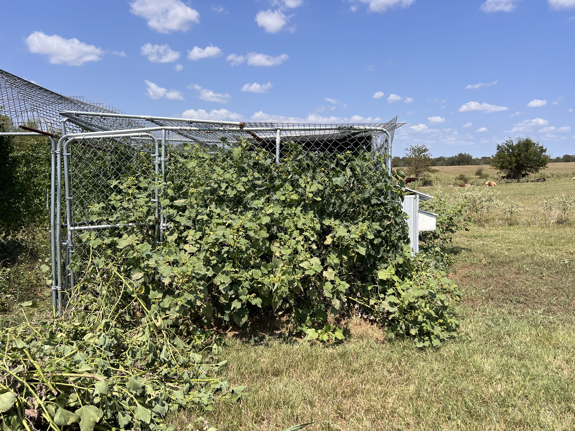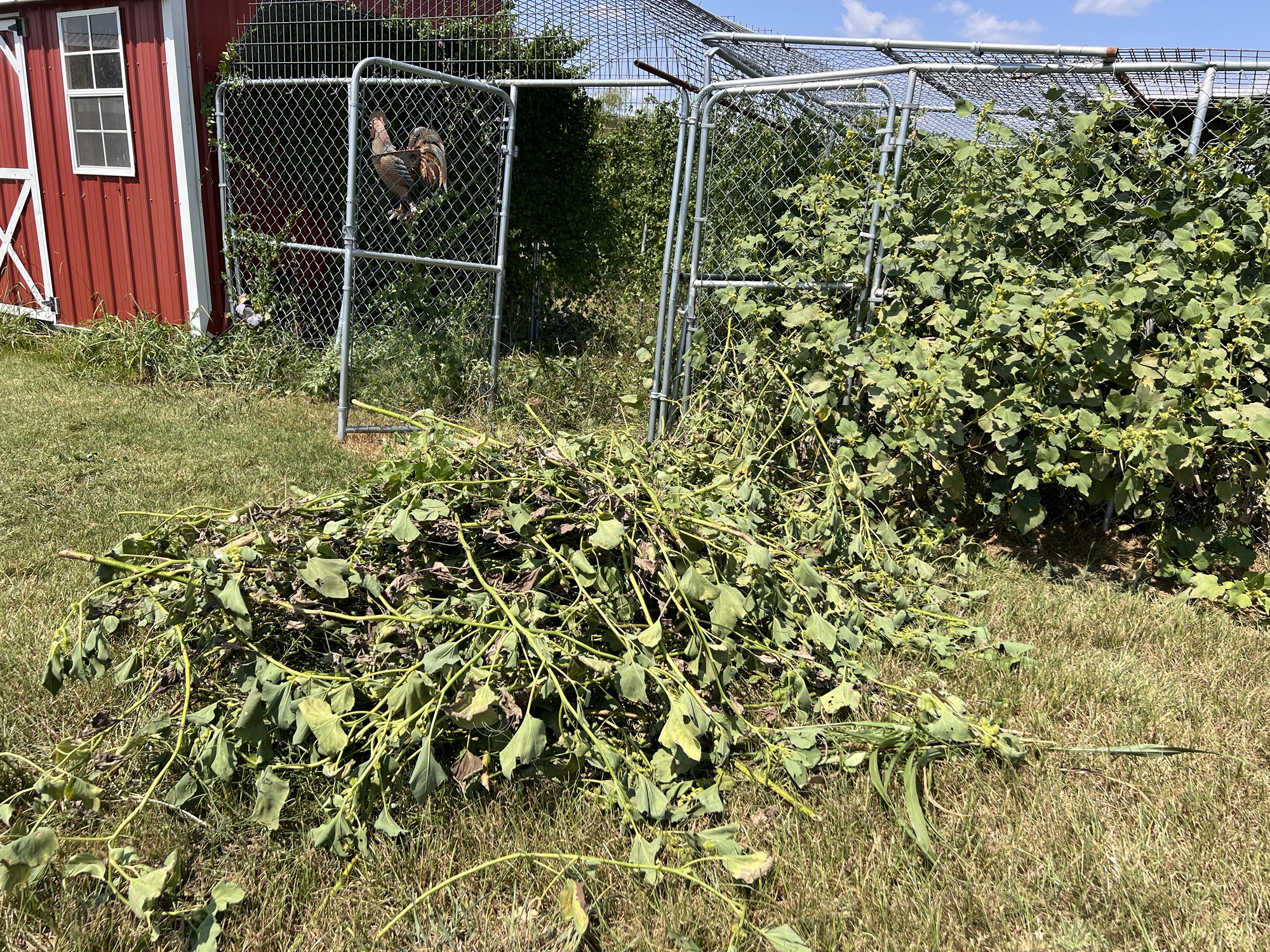I finally got to where I could make myself clean out the chicken coop and run. The chicken killings were hard on me. But today I murdered all the cocklebur and birdseed plants that had grown up in the main section. That was a very unpleasant task, especially since it’s gotten hot again suddenly.