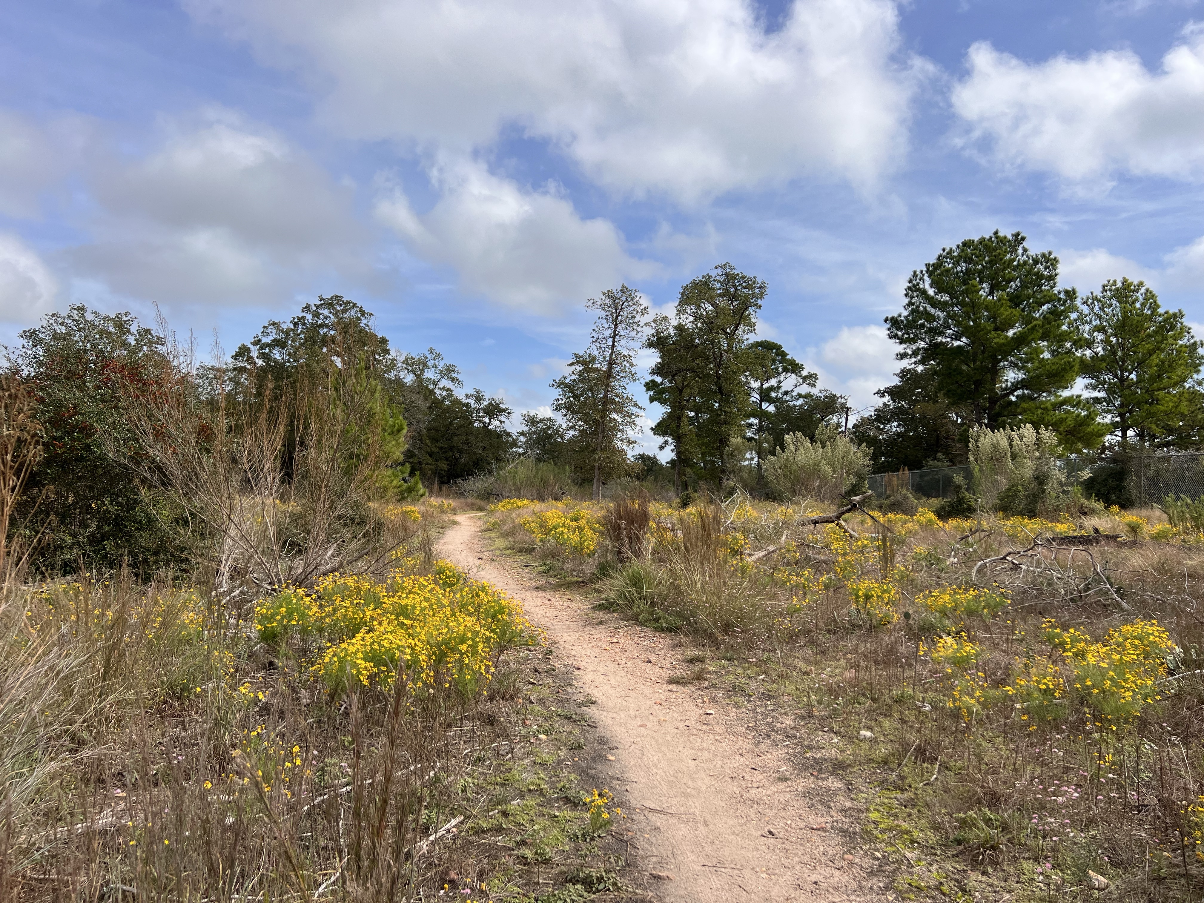 We had to drive to the trailhead, which was fine with me since it meant I could go down the beautiful park road again. We stopped at the official scenic overlook to enjoy the view of farms and the main highway to Houston below.