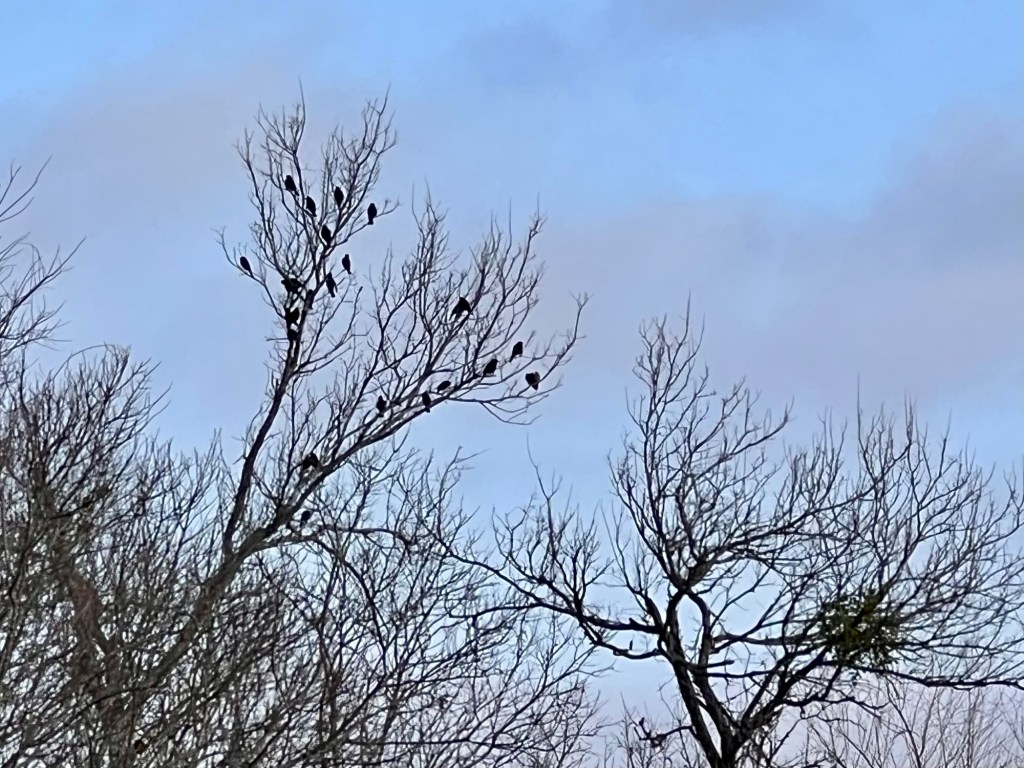 A picture from before we left: Brown-headed Cowbirds in a tree, gurgling away.