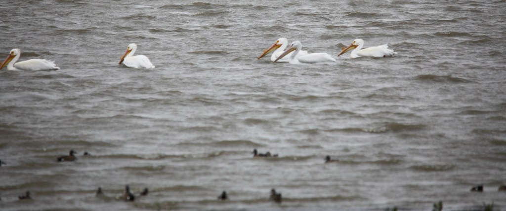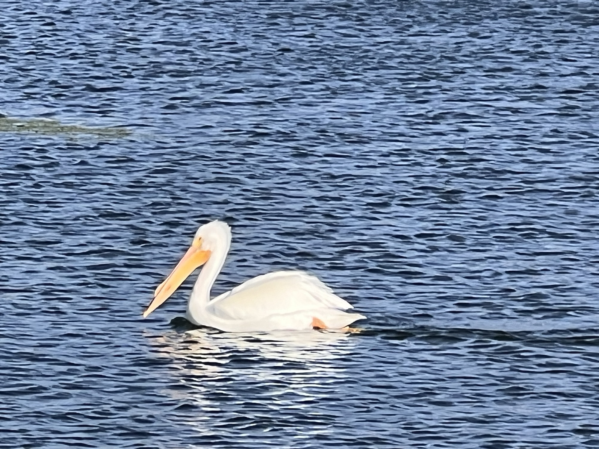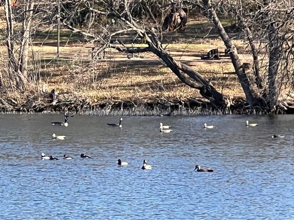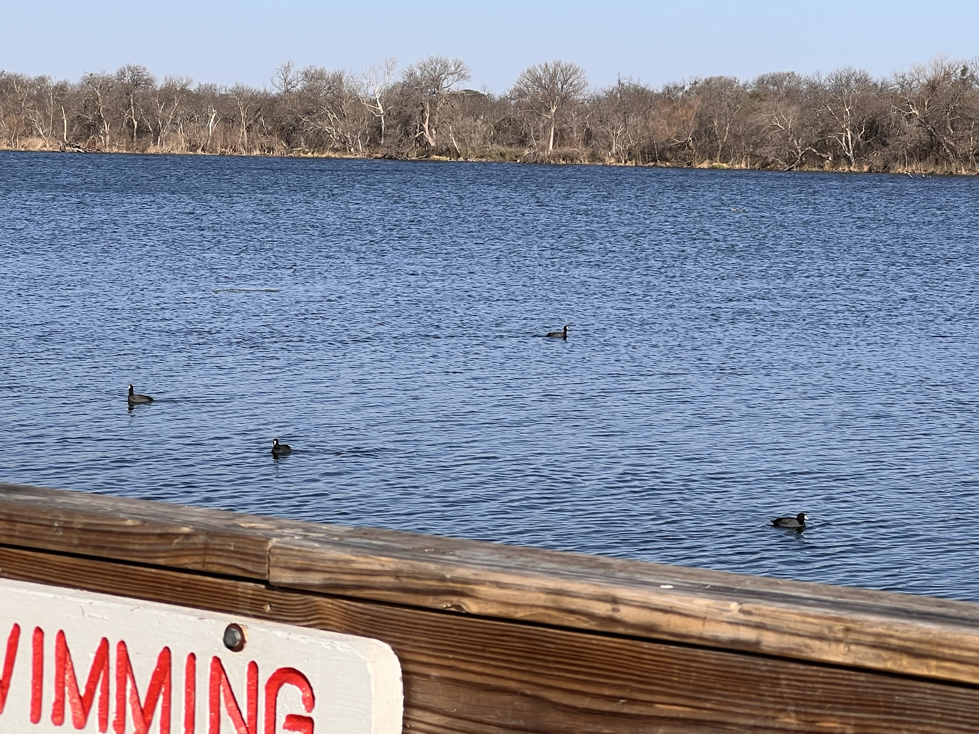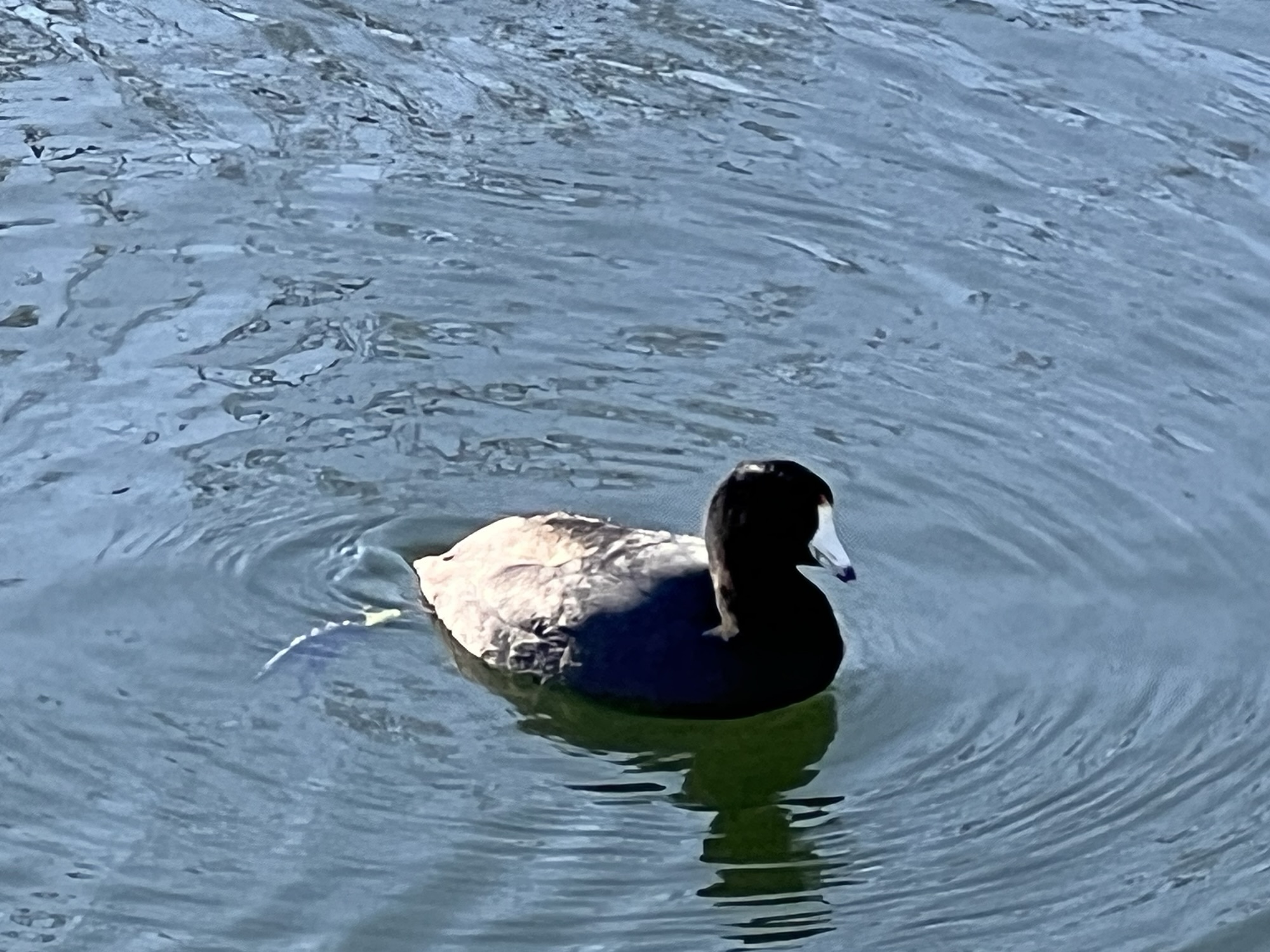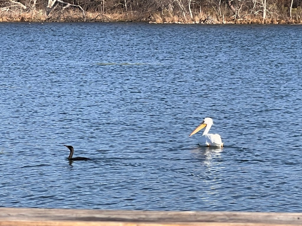 I enjoyed a half hour or so on the fishing dock, which was nice and quiet, other than quacking and honking. There was a pair of white pelicans as well as entertaining coots, a cormorant, and many ducks, including a Lesser Scaup in the mix. I greatly enjoyed the diving and popping back up that they were all engaging in. Just being around water and the life it supports made me feel better.
