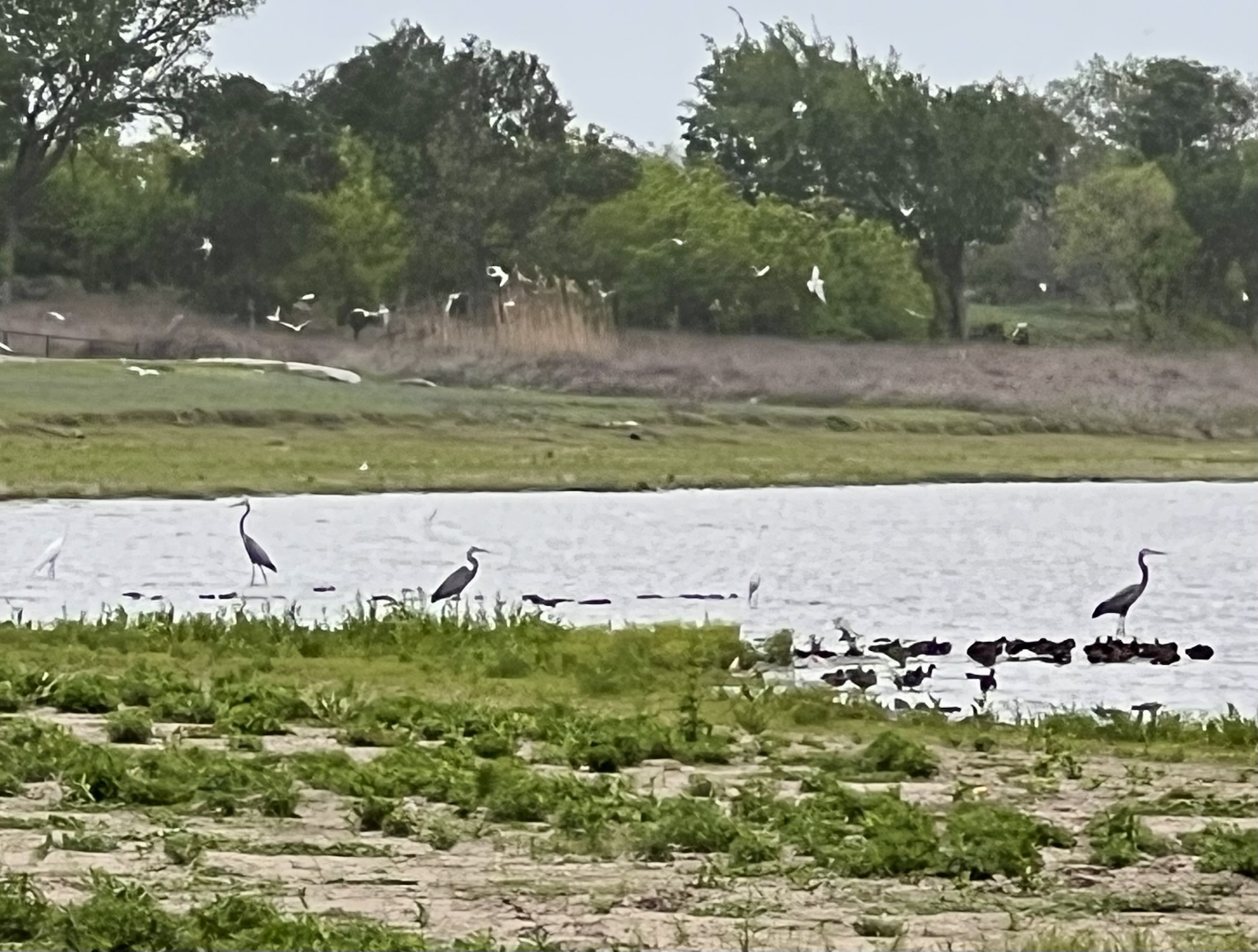 Forster’s Tern. Lee took the next few photos. PelicansWhite Ibis in flightCormorantI think it’s a NeotropicWhite PelicansGreat EgretsLesser YellowlegsLong-billed DowitcherThe ducks in here are shovelers Great Blue Herons and Great EgretsBonus: Texas Prickly Poppy