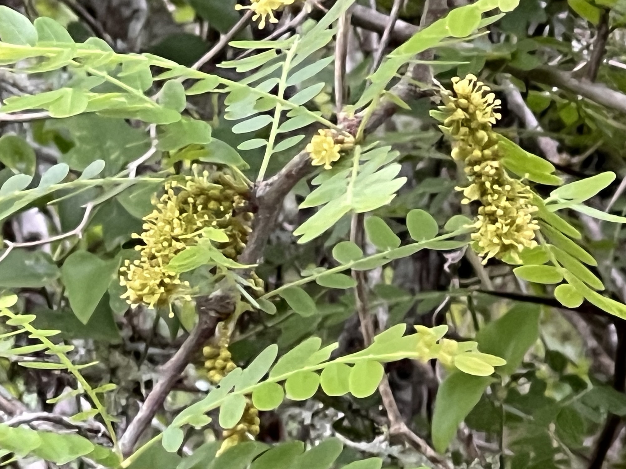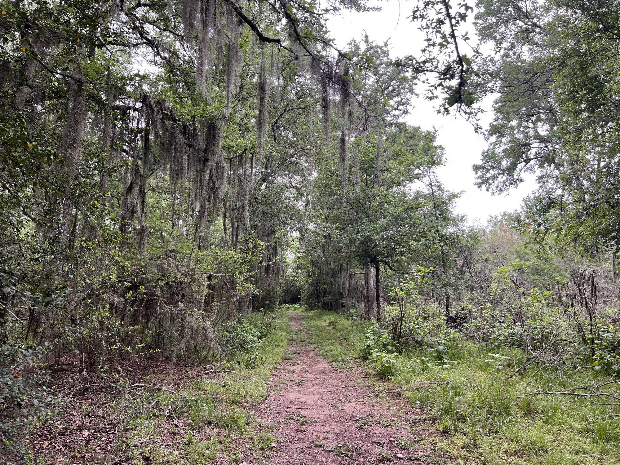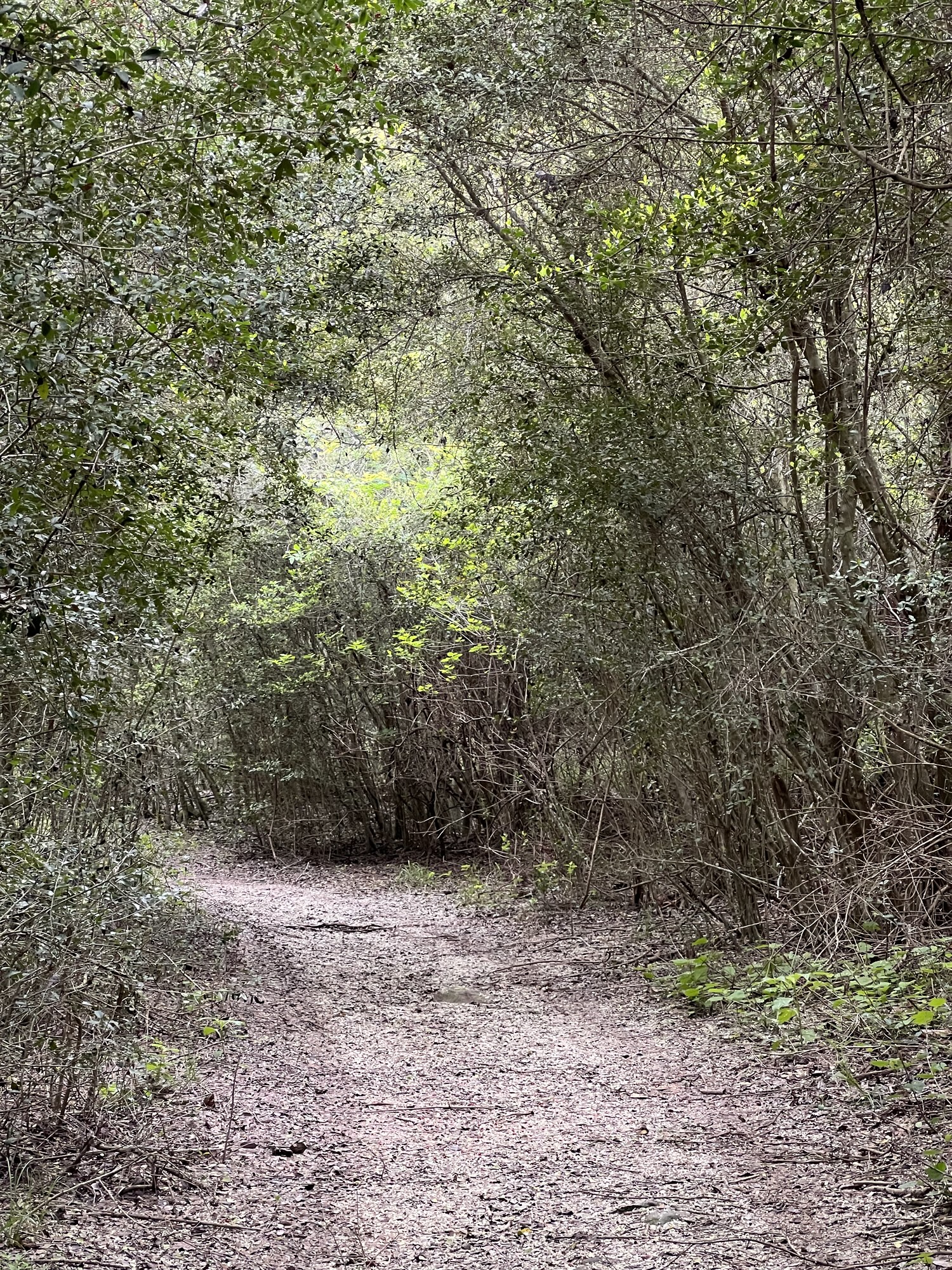 Mysterious trailSpanish moss on trees!Yaupon holly blossoms and berries on the trail. Interesting! Maybe a direction marker tree. Grapes blooming but not like mine at home. The scent maker! Yaupon. Honey LocustHoney Mesquite