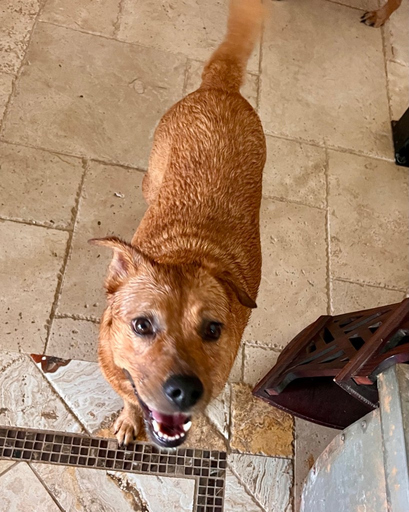 So, they showed up and the challenges of looking at our dogs commenced. Looking at Goldie was easy. She loves Kelly the vet tech and volunteered to be looked at, poked, and prodded by Amy, too. Then she happily trotted off to the truck to get weighed. We need more Goldies.