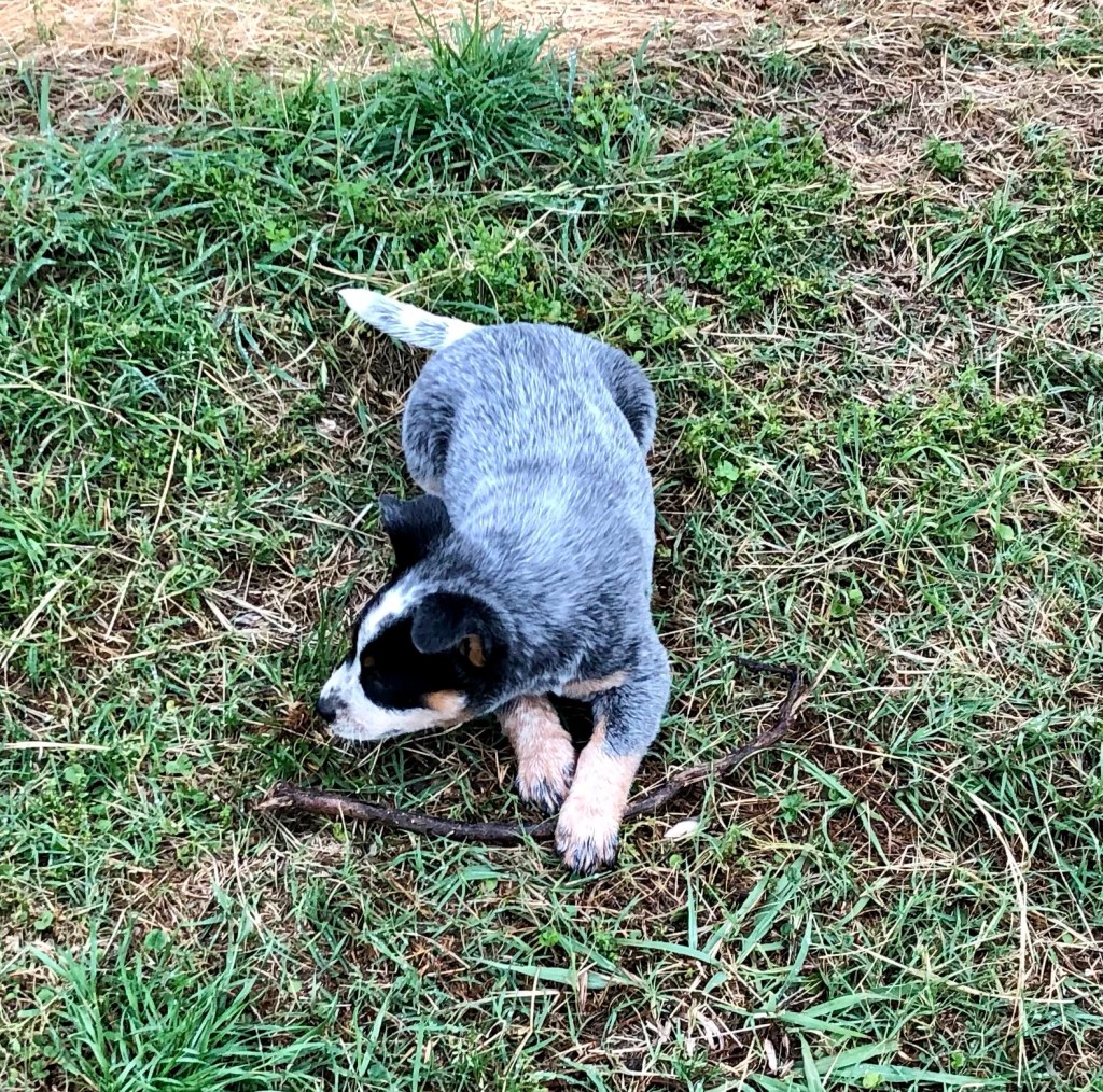 One of the little cuties has another home, where she’s going in a week or so, but we get to enjoy the other one (Bess) and watch her grow. Nothing like a bunch of rhyming cattle dogs to brighten the neighborhood! They now have 5 generations of the same maternal line at their house.