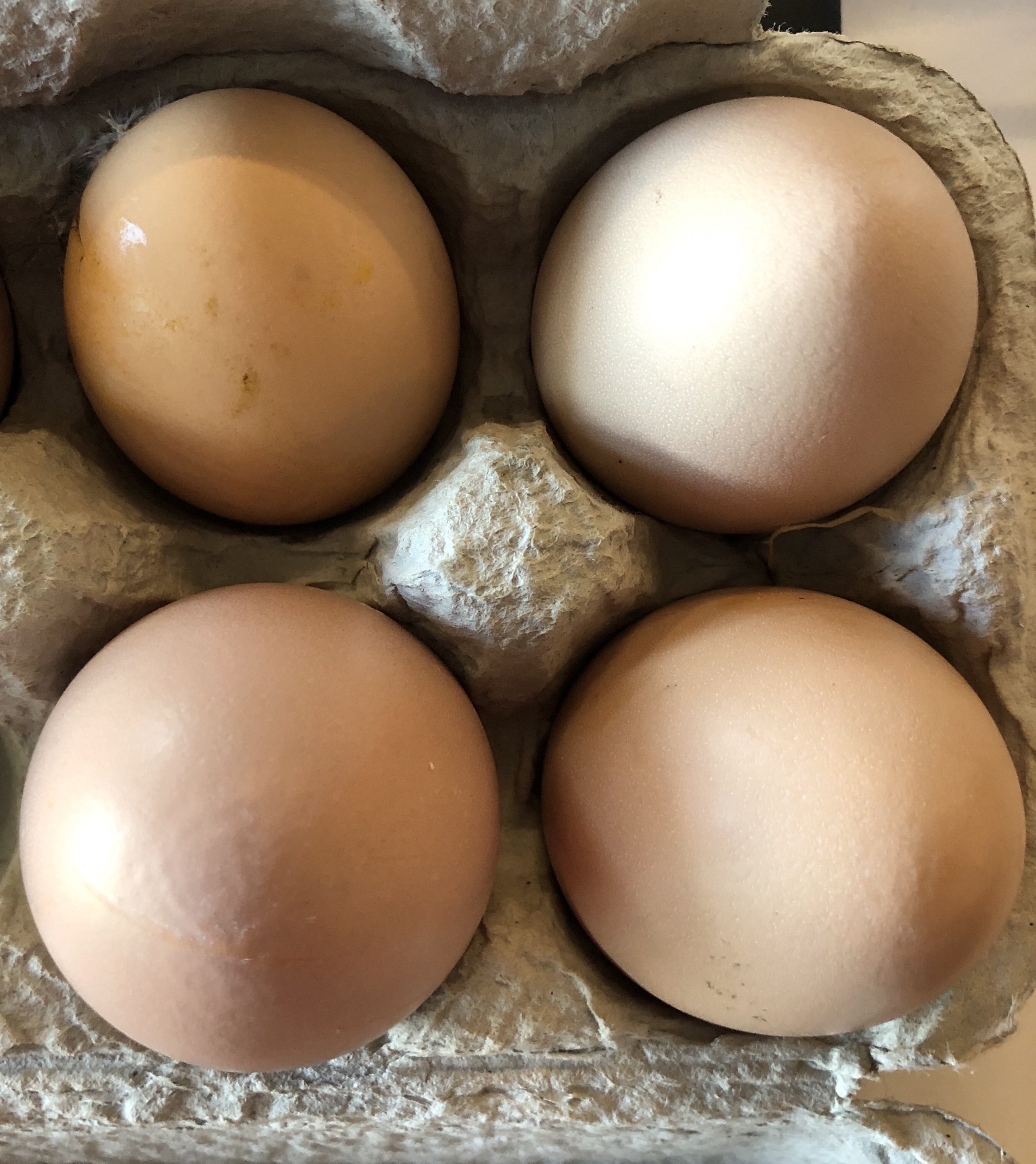 Variation in egg sizes. Top left is a pullet egg. Bottom left is the big “rosy” one that I am not sure who lays, but it’s BIG. The other two are normal brown eggs from brown hens.