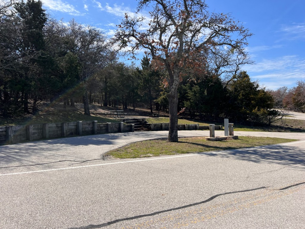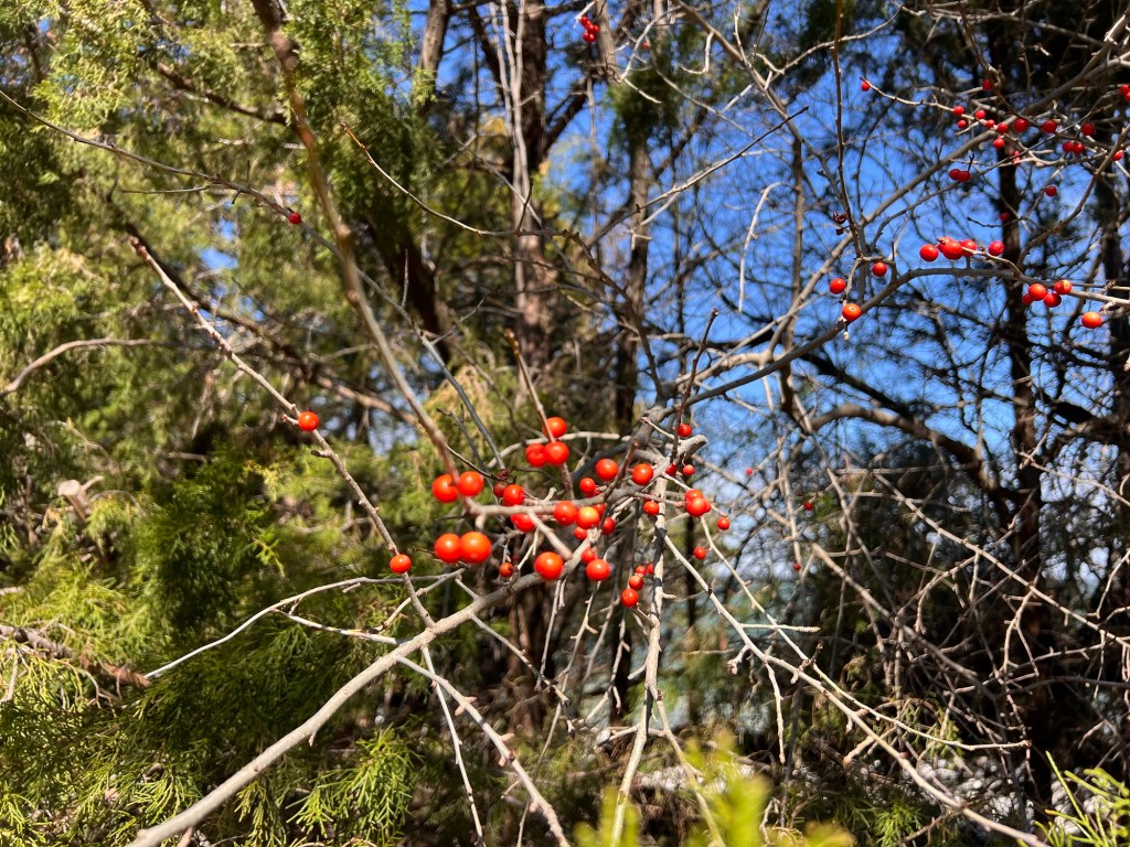 After my walk, Lee and I went out into the Texas Hill Country (the middle of it this time), ostensibly to get some space heaters. We first stopped at Lyndon B. Johnson State Park (also a National Park, to get our park passport stamped and a magnet for our collection, though we’d both been there before. I still really like this place, even in winter with no wildflowers. You could see birds, though, and I was delighted to observe a flock of Eastern Bluebirds in a nice leafless tree.