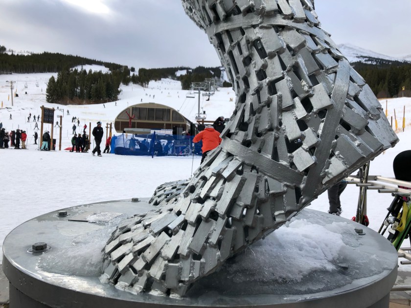 Back into the Subaru we went, headed to the ski sites that we didn’t see last week. I think I grew tiresome repeating, “It’s so pretty” under my breath. After a stop to get water (because Cathy had skied in brisk wind this morning and was all dried out), we headed out to their favorite ski area, which is Keystone. It was a lot of fun to look at all the beautiful river and statues there. Lots of people were skiing, so I enjoyed all the people in their outfits as they warmed up at little fires and went to drink beer. It was quite stereotypical, but still fun to see. I can see why Cathy likes it there. There will be a LOT of slopes to ski down as it gets colder and snowier.