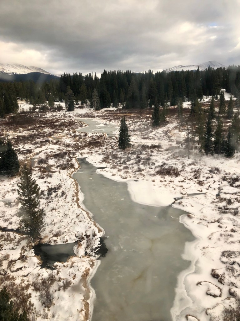 Next, Ken drove us to the other side of Breckenridge, where we took a ride on the free gondola that takes you up to some resorts way up in the mountains (but not all the way up). The scenery we saw was so wonderful. You pass over a wetland that must be great in the summer and becomes cross-country skiing area once the snow gets deep. It was just right today, with some ice and some flowing water.