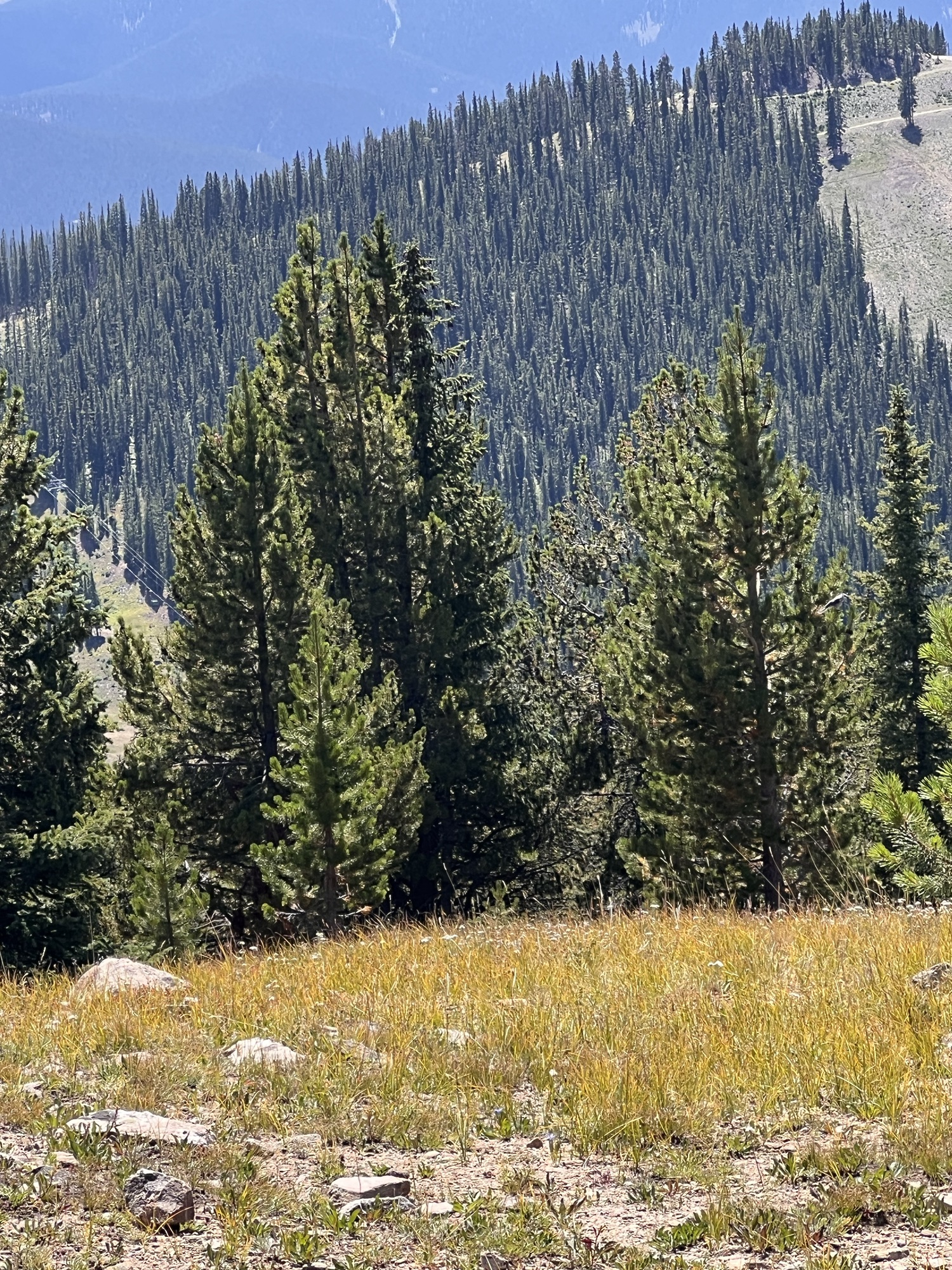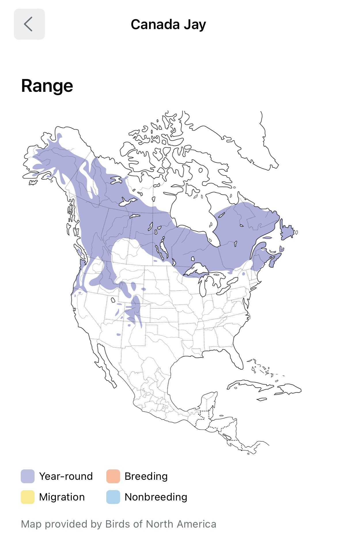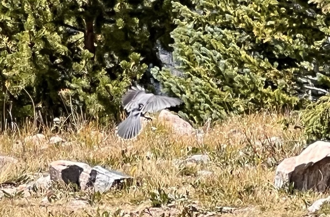 I enjoyed lots of the usual mountain birds, but there was one I’d never seen before. It was a big, solid gray bird with white along its tail. I couldn’t get really close to it or its friends, but I did manage to get clear enough photos that both Merlin and iNaturalist were able to ID them as a bird I’d never heard of: a Canada Jay. Yes, they live here and are birds of high mountains. I think the map of where they are found is interesting.