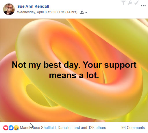 I realized that I have support that transcends all boundaries, if I only remember it’s out there and reach out. Those 128 likes and 93 commenters include people I’ve known since I was a child, people I’ve never met, elders, youth, people I disagree and agree with, and people from: