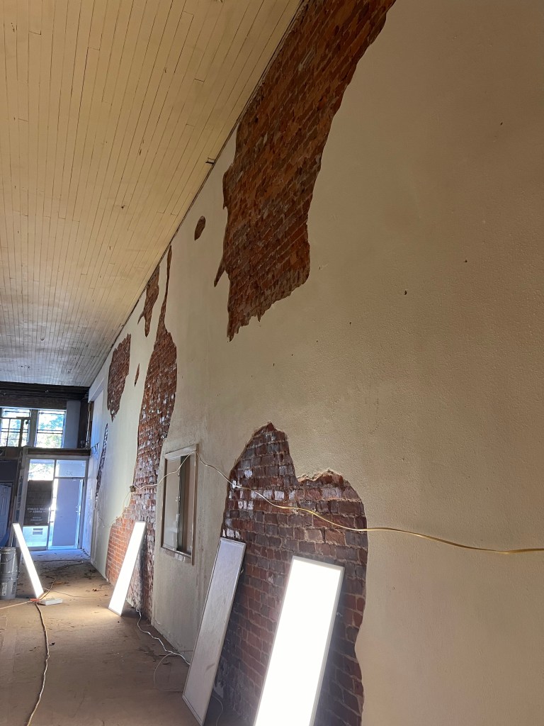 Next we wandered across the street to the old JC Penney building and its neighbors, where my son was painting walls and sealing bricks. It fascinates me to see the bones that were hiding in the former bland county offices.