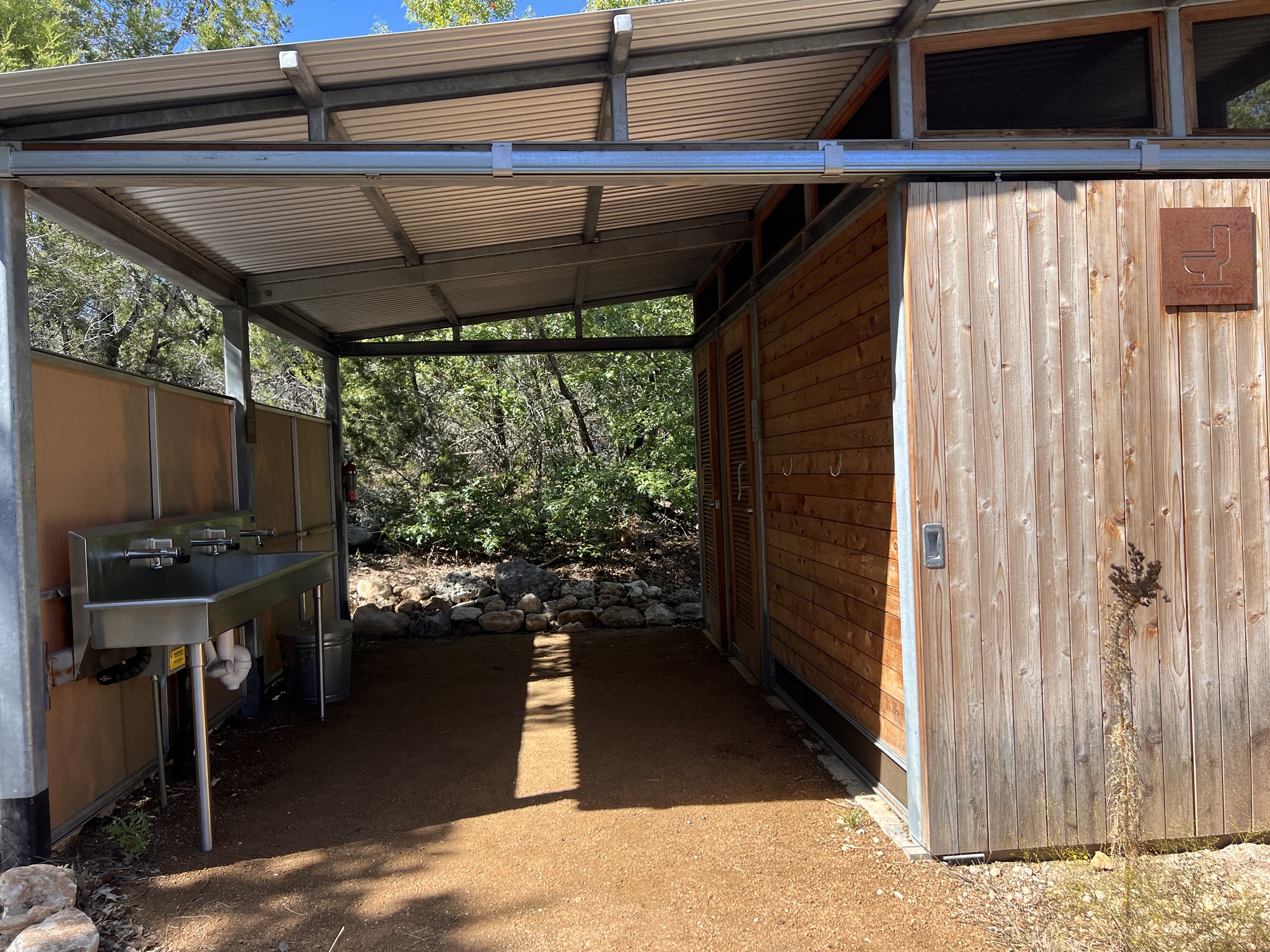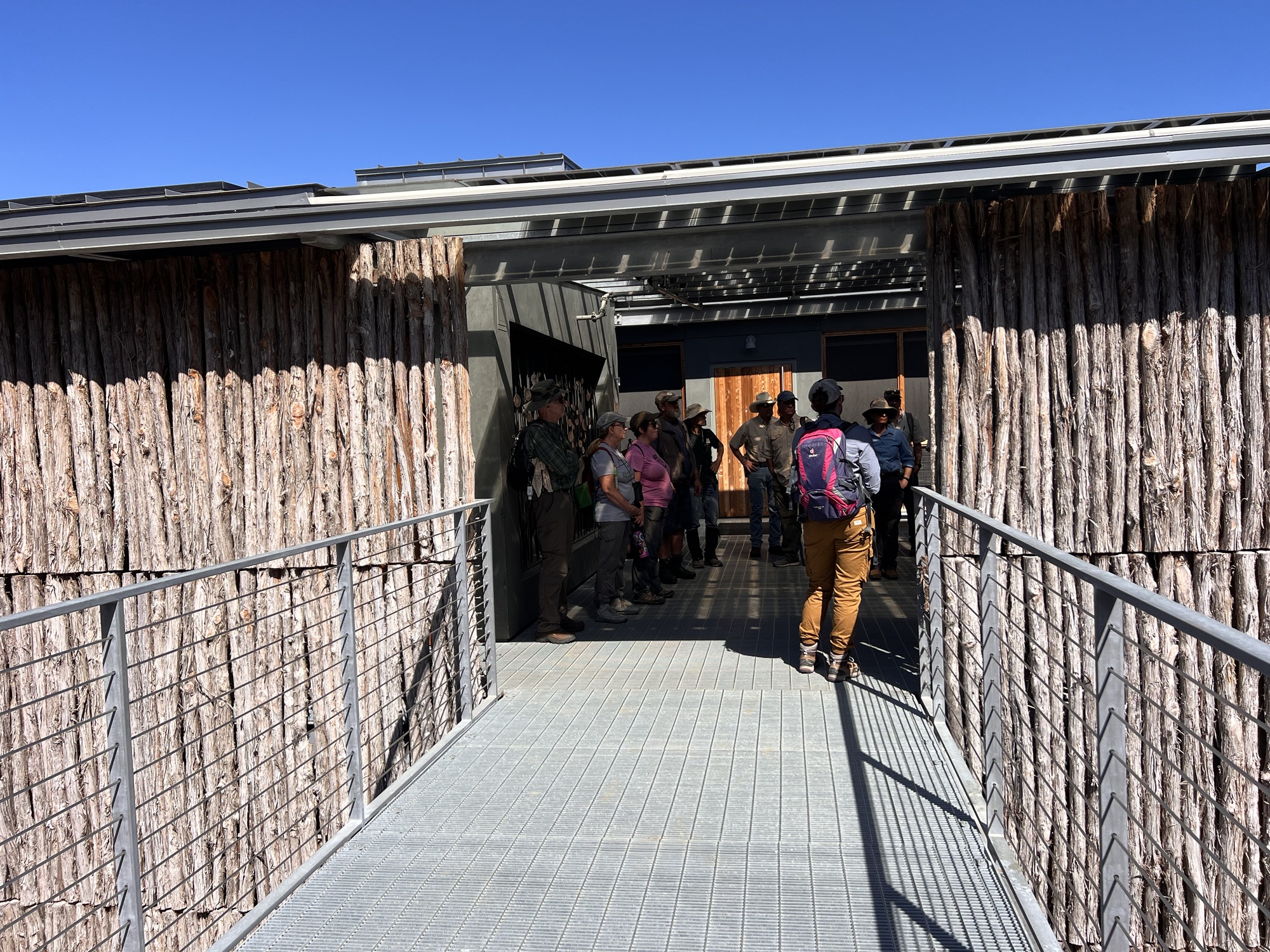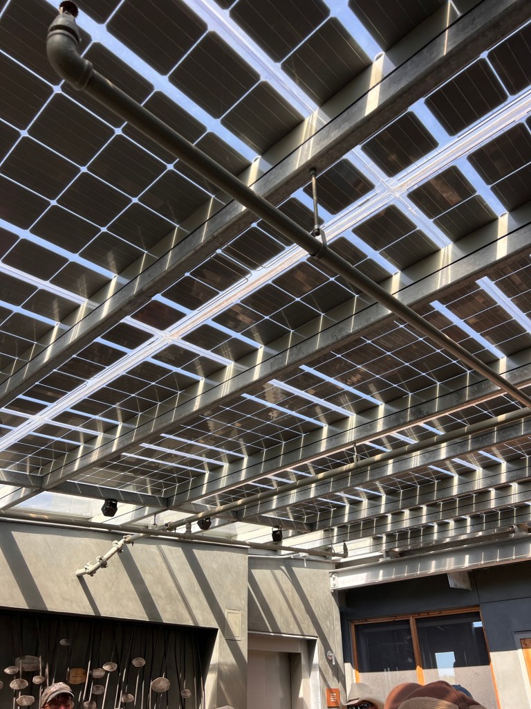 After the work, we ate our sack lunches in the impressive dining pavilion. It’s all solar powered and all the water is harvested rainwater. There’s no air conditioning, but it was perfectly pleasant inside. And at one end was a garage door of windows that could be cranked open, to be replaced by screens. Very clever.