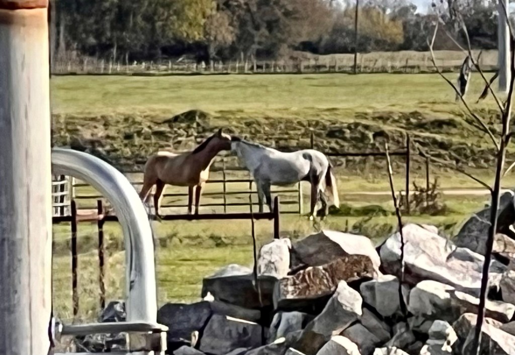 Other than enjoying birds, I enjoyed the horses. This morning I caught them at playtime, which involved Drew and Dusty nuzzling then running down the pasture to the pens, rearing and pawing, then running back. Dusty still has it in him! (Pictures are blurry because I was far away.)