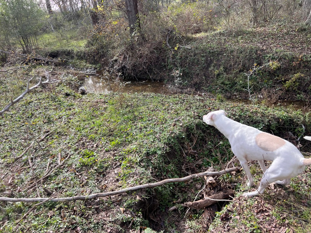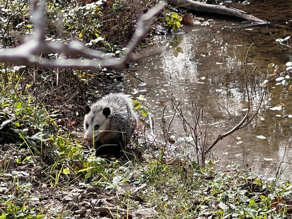 The other encounter I had came when Carlton and I took a walk in the woods. Suddenly he froze. I think he was trying to point like a hunting dog. We’d come upon an opossum along the stream bed. he must have smelled it, since he doesn’t see well.