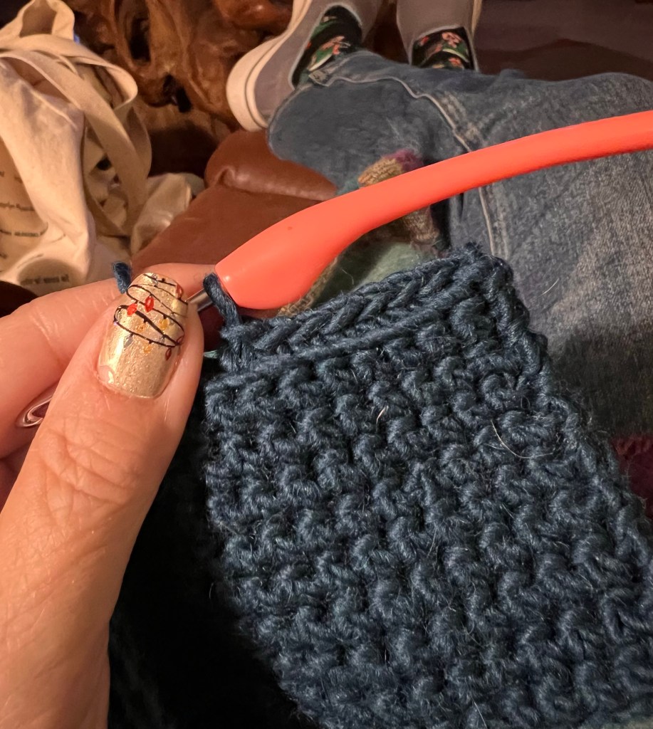 Maybe when the temperature blanket is done I’ll make a large one like Lily Chin did. Hers was long, and folded over at each edge to make holes you can stick your hands in while slipping the main part under a casserole. It was cool. Also, turning it under hides any ugly edges, heh heh.