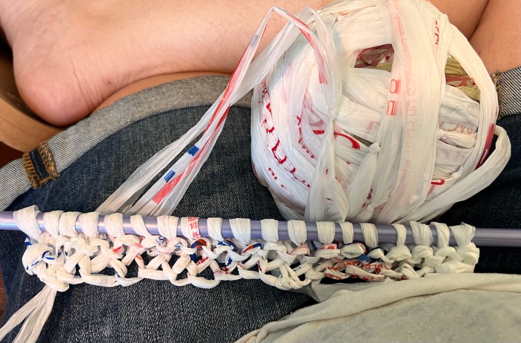 I mentioned last week that my friend Steve’s cousin had made many balls of plarn, which is strips of plastic from those ubiquitous plastic shopping bags. The cousin had been very busy, and made them much more even and consistent than my early attempts. I brought them home and promised to make something to give to a charity. But first I had to experiment.