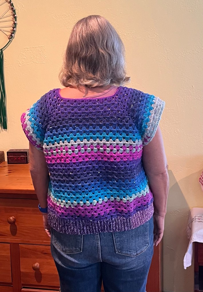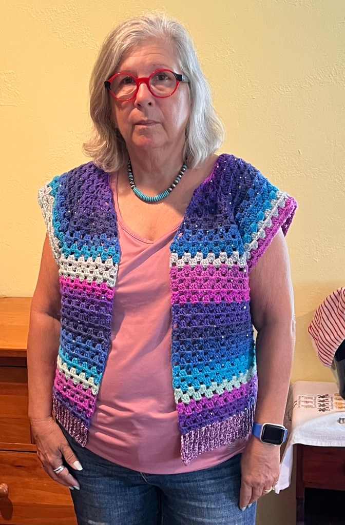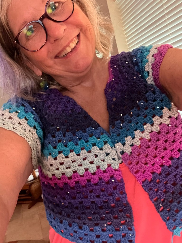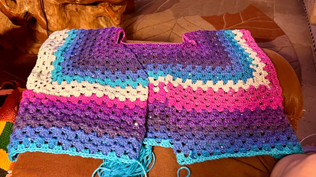A lot of people do a craft project during the Olympics. I didn’t intend to do one, but a friend crocheted something I thought was cute, so I picked up some leftover Mandala yarn and started this Granny Pop cardigan. You can find it on Ravelry or search for it.