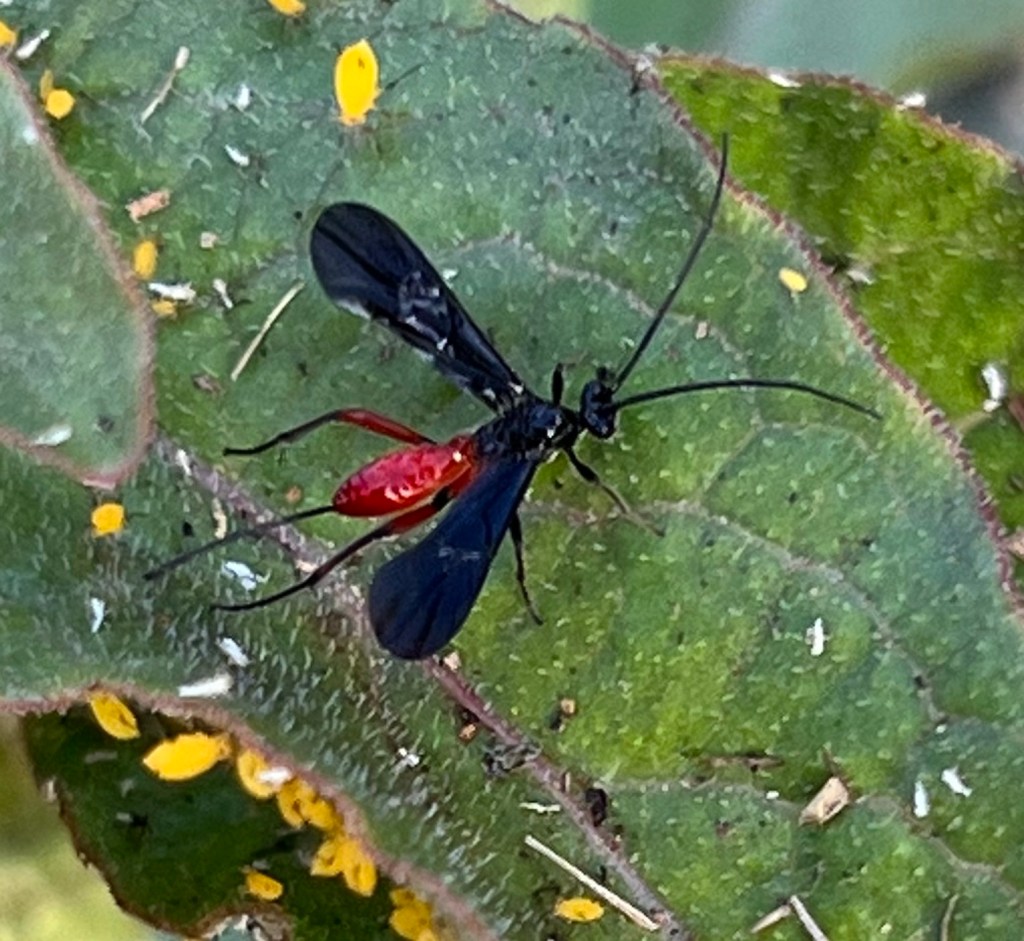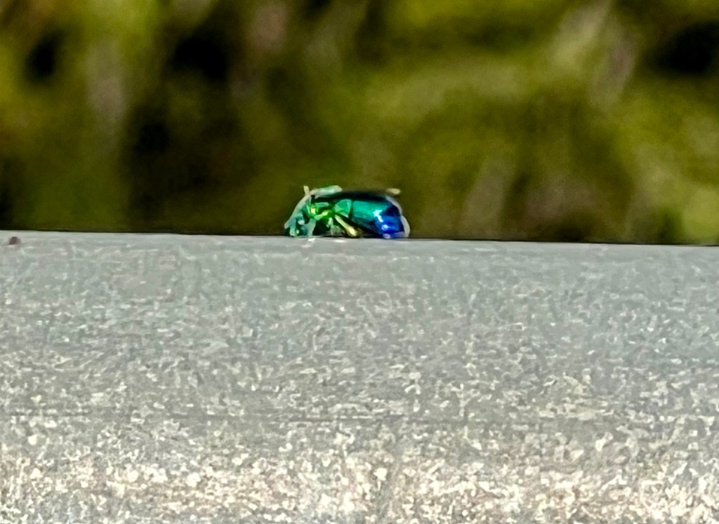 Look! I was curious as to what this is. It’s a bluish-green cuckoo wasp. I found out it’s a parasite on mud dauber nests. Hmmm.